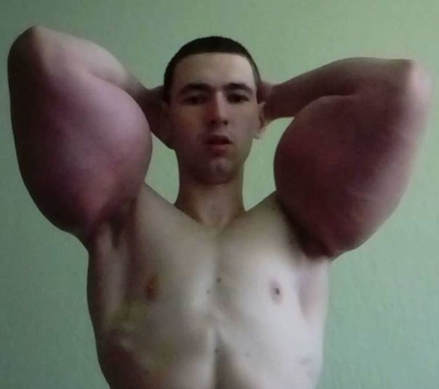 Naime, Kirill svoje mišiće povećava ubrizgavajući direktno u njih kombinaciju kemikalija koju sam radi kod kuće, a koja je bazirana na Synthol ulju, popularnom među nekim bodybuilderima. Iako su na mišićima ovog 21-godišnjaka već vidljive promjene boje uzrokovane opasnim kemikalijama, on ne odustaje od ubrizgavanja supstance zbog koje mu mišići izgledaju neprirodno ogromno.