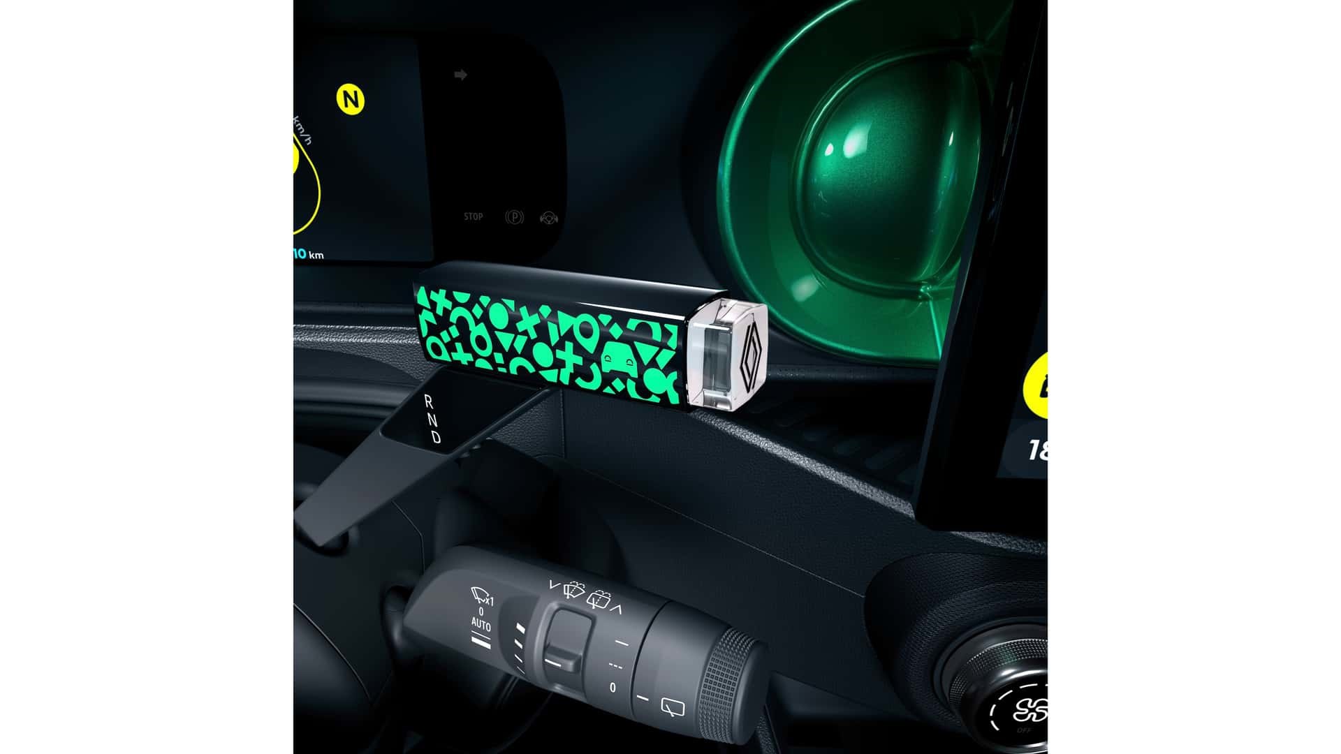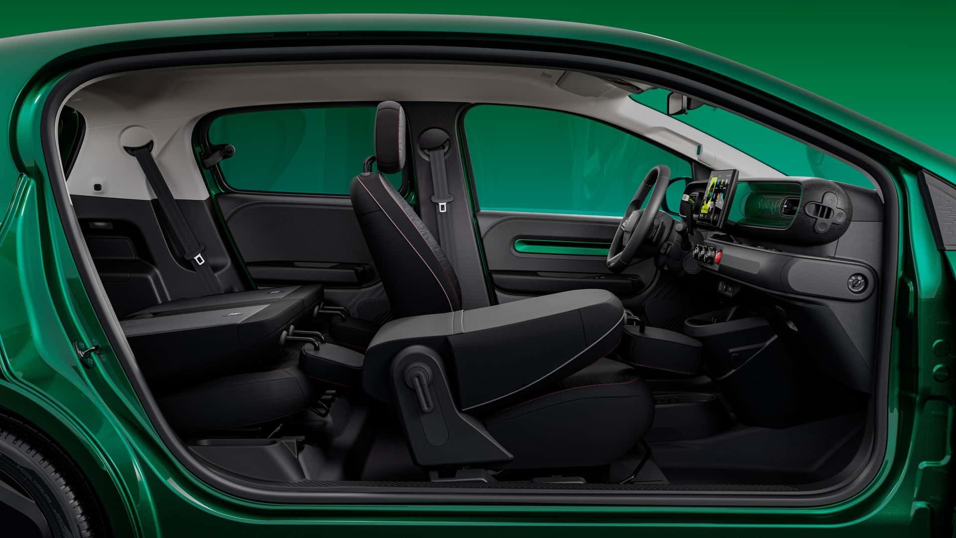 Kabina novog Twinga pritom zadržava živahnost koncepta, ali s racionaliziranim troškovima. Renault planira početnu cijenu od 20.000 eura, pa se ipak mora malo štedjeti. Unutrašnjost krase šareni umetci, poseban uzorak na krovu s motivima "Twingo abecede" te ručni mjenjač u obliku ruža za usne, koji Renault naziva "e-pop shifter".