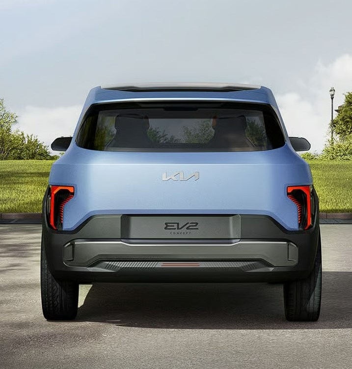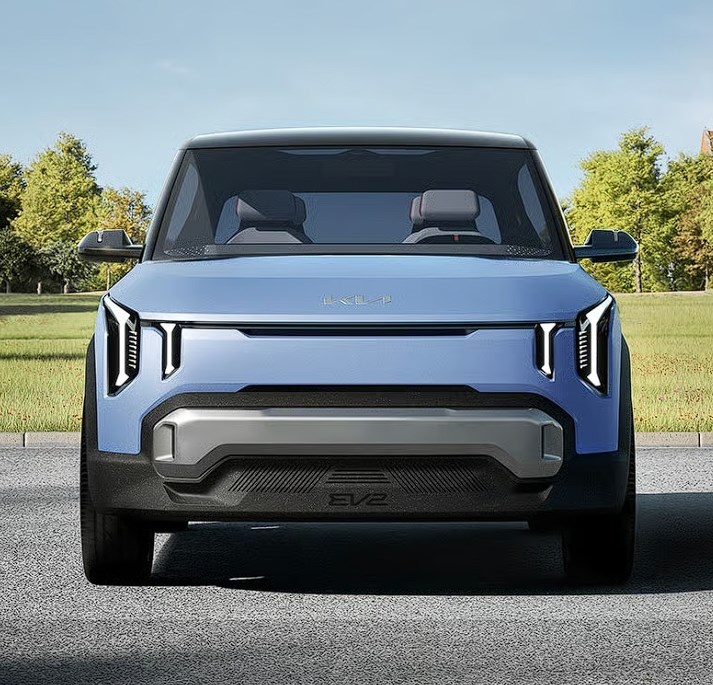 Prijelaz s koncepta na serijski model pokazuje da će EV2 zadržati većinu ključnih dizajnerskih značajki. Sprijeda dominiraju okomito podijeljena prednja svjetla koja uokviruju tehničku masku, dok se dnevna svjetla (DRL) u obliku kuke protežu preko blatobrana. GT varijanta bit će vizualno agresivnija zahvaljujući velikom donjem usisniku inspiriranom modelom EV9, s geometrijskim elementima u boji.