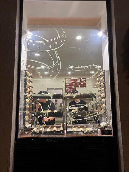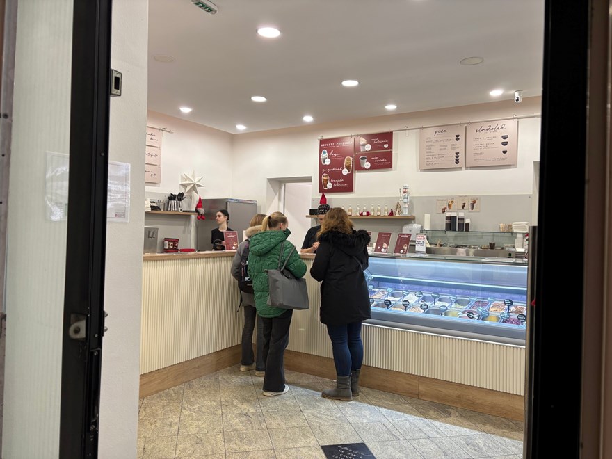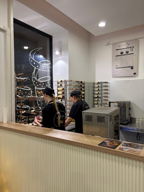 Iz lokala dopire glasna božićna glazba, svjetla su dobro postavljena, a veliki prozori otkrivaju radnice kako pripremaju tijesto i motaju ga na drške - klasična faza izrade kürtőskalácsa gdje se dizano slatko tijesto omota oko metalnog valjka, premaže uljem i šećerom, a zatim peče kako bi se šećer karamelizirao i stvorio karakterističnu koricu.