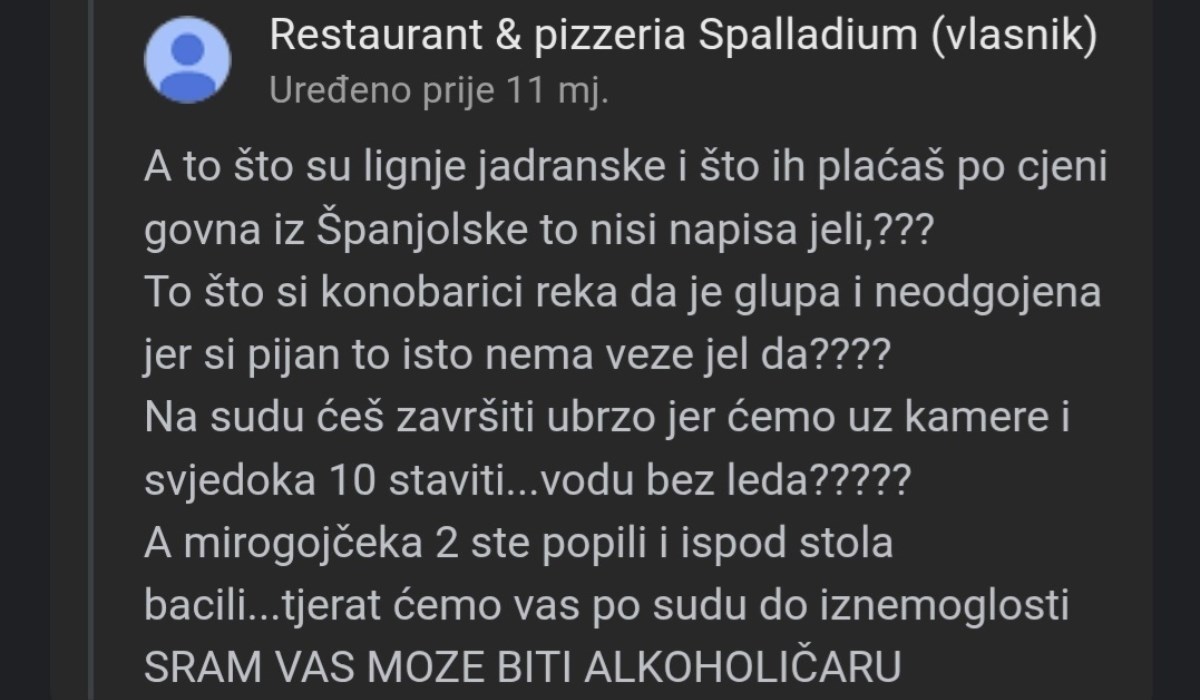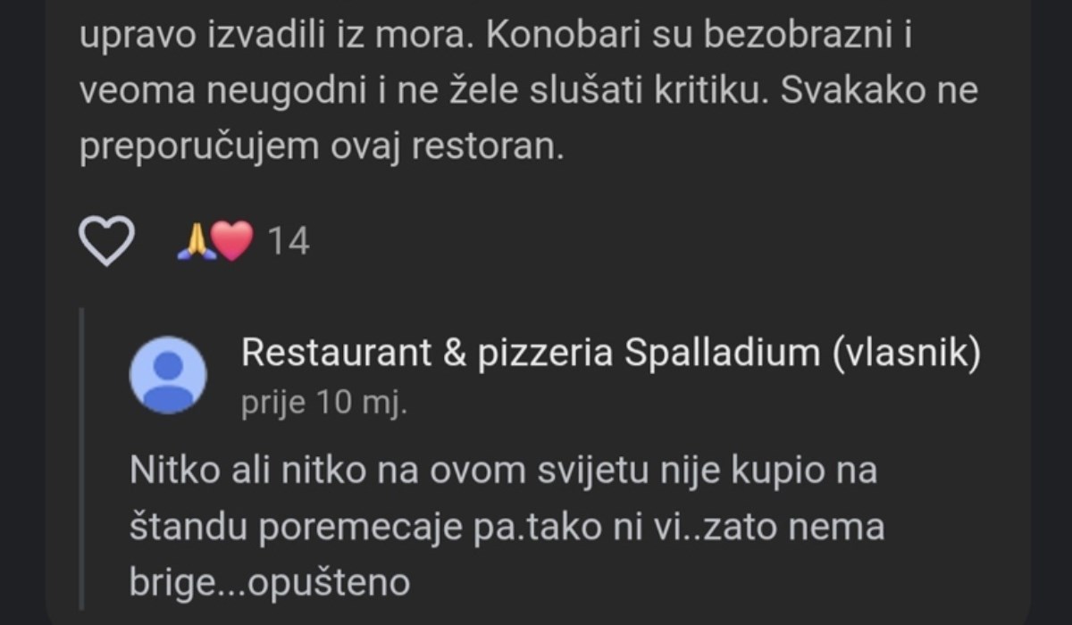 Riječ je inače o ugostiteljskom objektu u Pirovcu koji ima uglavnom pozitivne recenzije, s ukupnom ocjenom 4.4 na Googleu. Recenzije ostavljaju i domaći i strani turisti, a među gomilom pozitivnih recenzija, tu su i oni koji su ostavili kritike ili koju zvjezdicu manje, a vlasnici restorana odmah su im odgovorili - i to na nimalo lijep način.