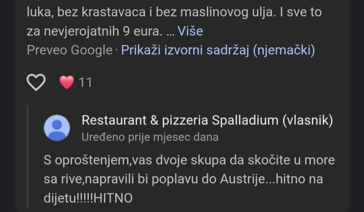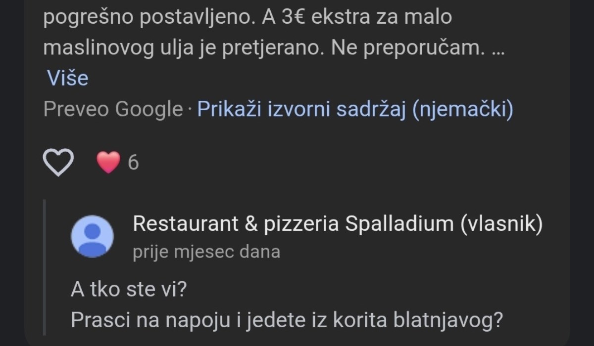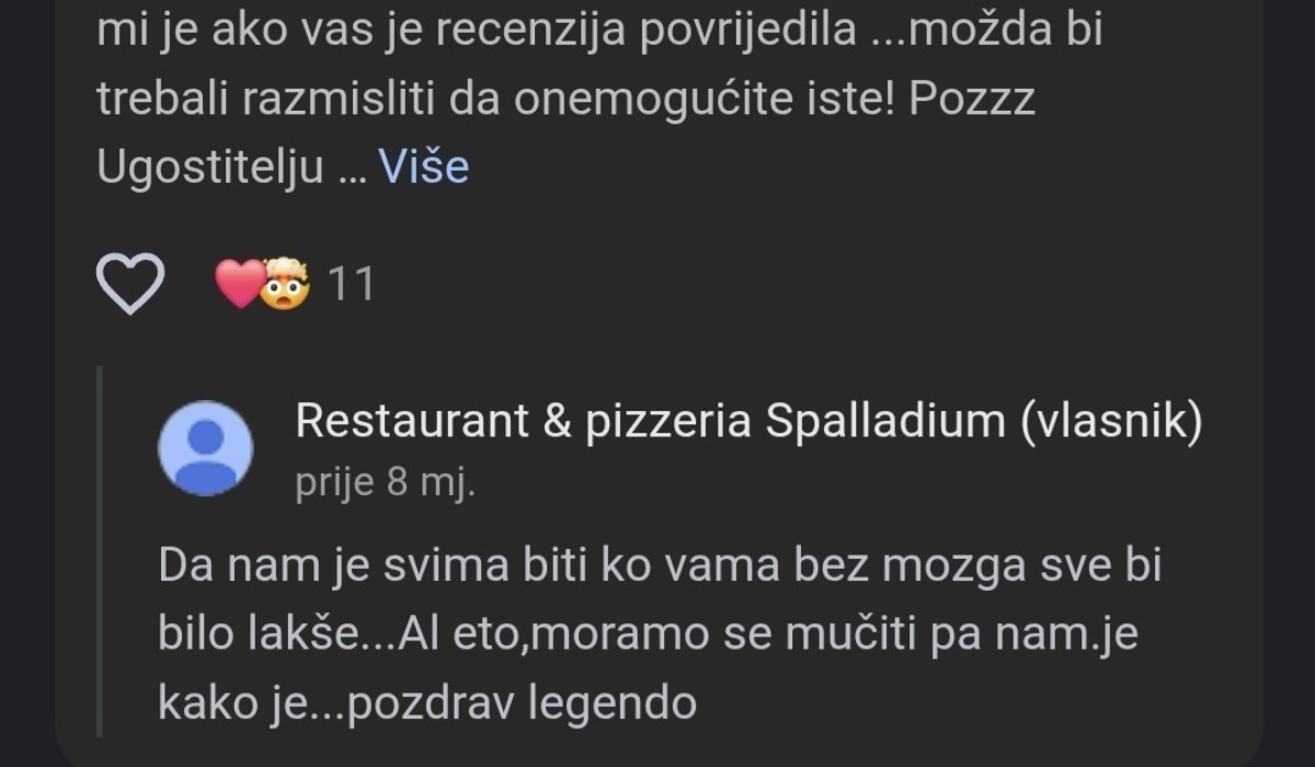No, to nije jedini takav slučaj - u drugoj recenziji jedna se mušterija žali na visoke cijene i osoblje koje ne zna sastojke hrane, a vlasnici restorana pišu: "Andrija... hm... bolje da ne stavljam slike naše od prošle noći, je li da, hahaha... bilo bi po tamburi od žene da te vidi s Kristinom opet, hahah".