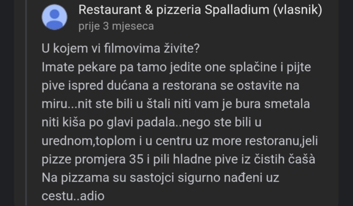 Na recenziju od jedne zvjezdice bez komentara, iz restorana su pak napisali: "Tu zvjezdicu će ti mama na čelo dobiti prilikom upoznavanja na PornHubu".