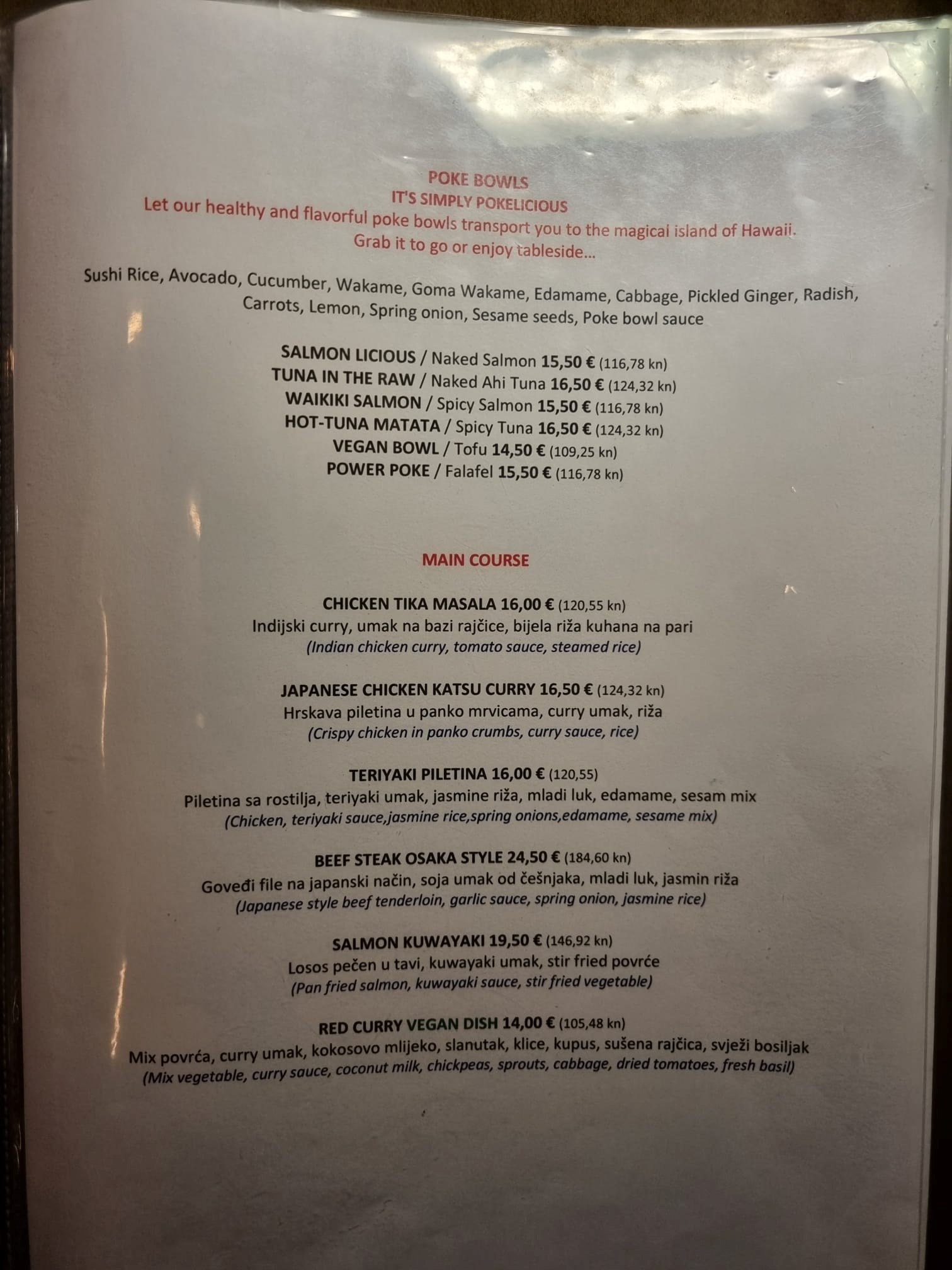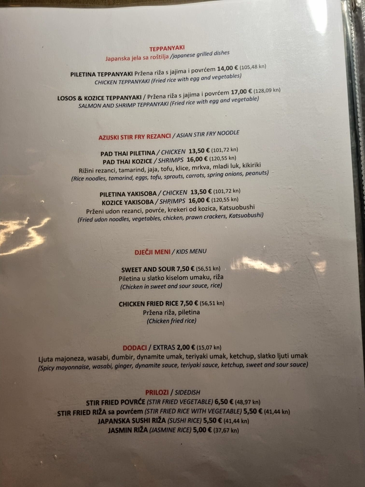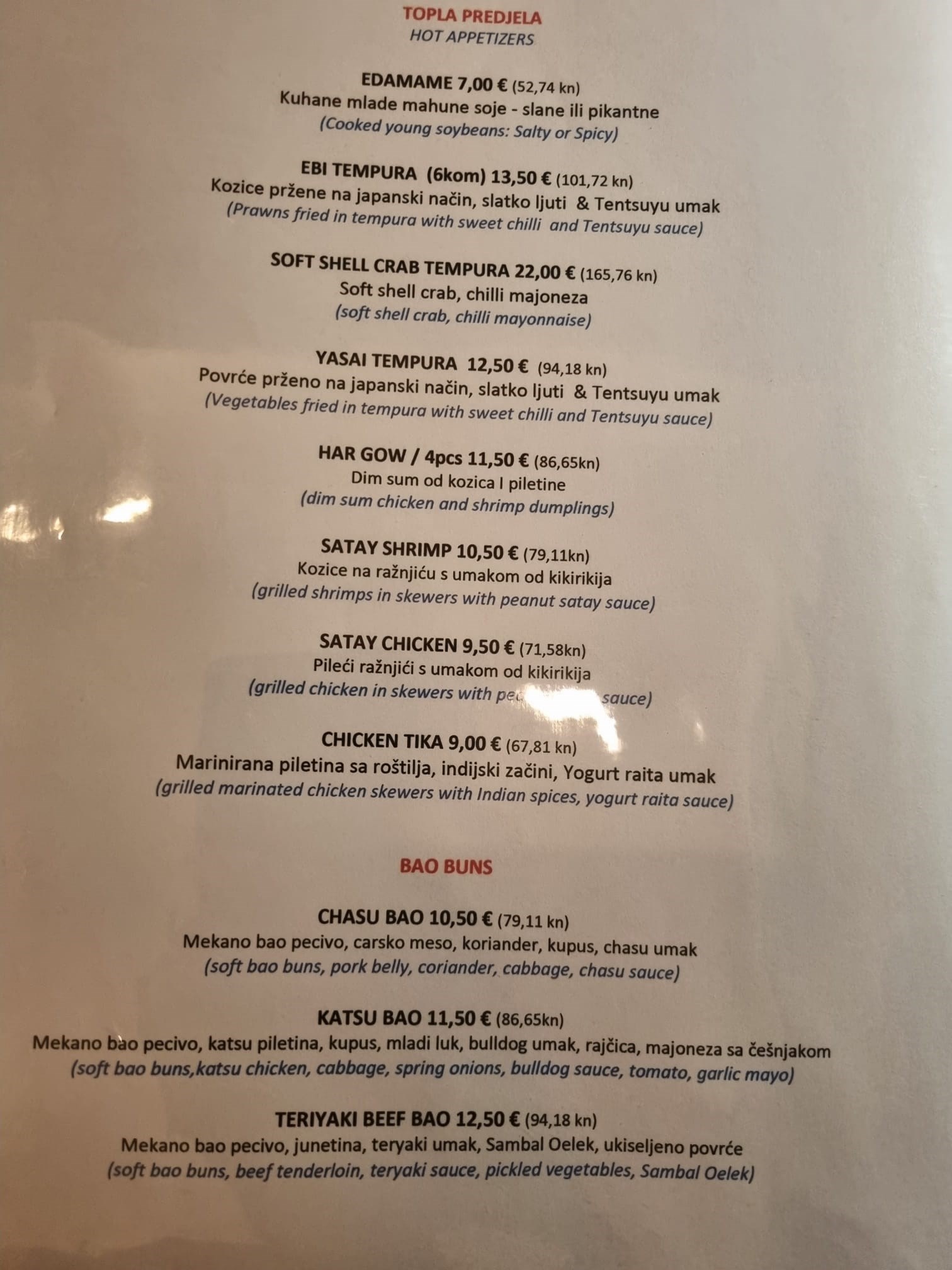 Jelovnik koji možete pronaći u galeriji prilično je dug, čega nismo baš najveći fanovi, no nudi neka prilično atraktivna jela, a mi smo nakon kraćeg, ali teškog razmišljanja odabrali gyoze, bunse, ramen, Pad thai te sushi.
