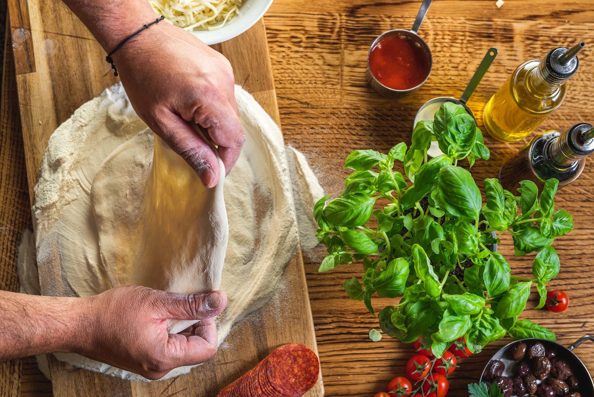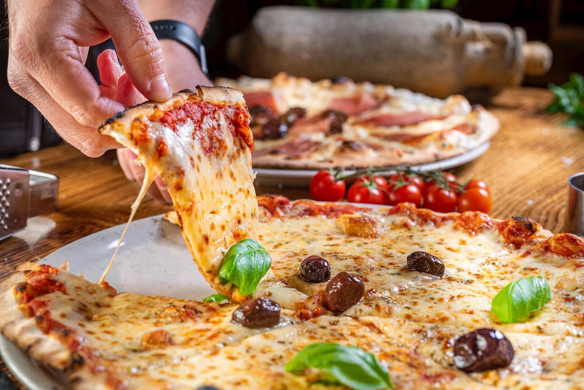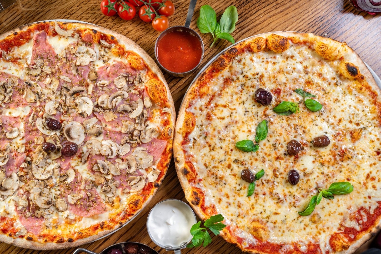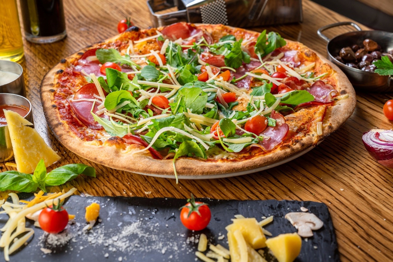 Središnje mjesto kuhinje zauzimaju kuhari koji svakodnevno razvlače tijesto za neku od više vrsta pizza iz njihove ponude koje se peku isključivo na drva. Na meniju se, uz standardne, nalaze tanke, bogate i pizze skoro bez ruba. Tu su i ljute varijante, one s četiri vrste sira, te druge romana style pizze.