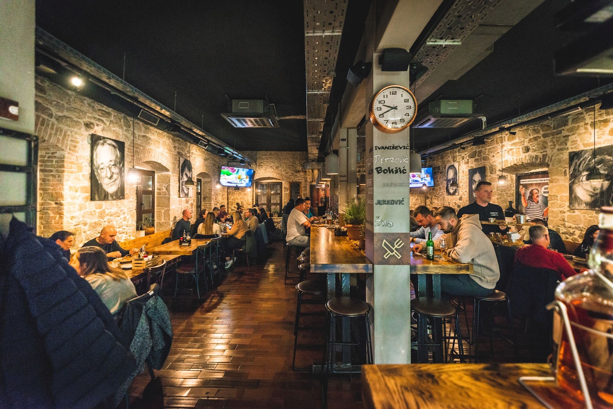 Interijer Bakre kombinacija je modernih detalja i stoljetnog kamena koji dugo upija glasove, smijeh i pjesmu posjetitelja. Na zidovima stoje portreti splitskih velikana kao što su Oliver i Dino.