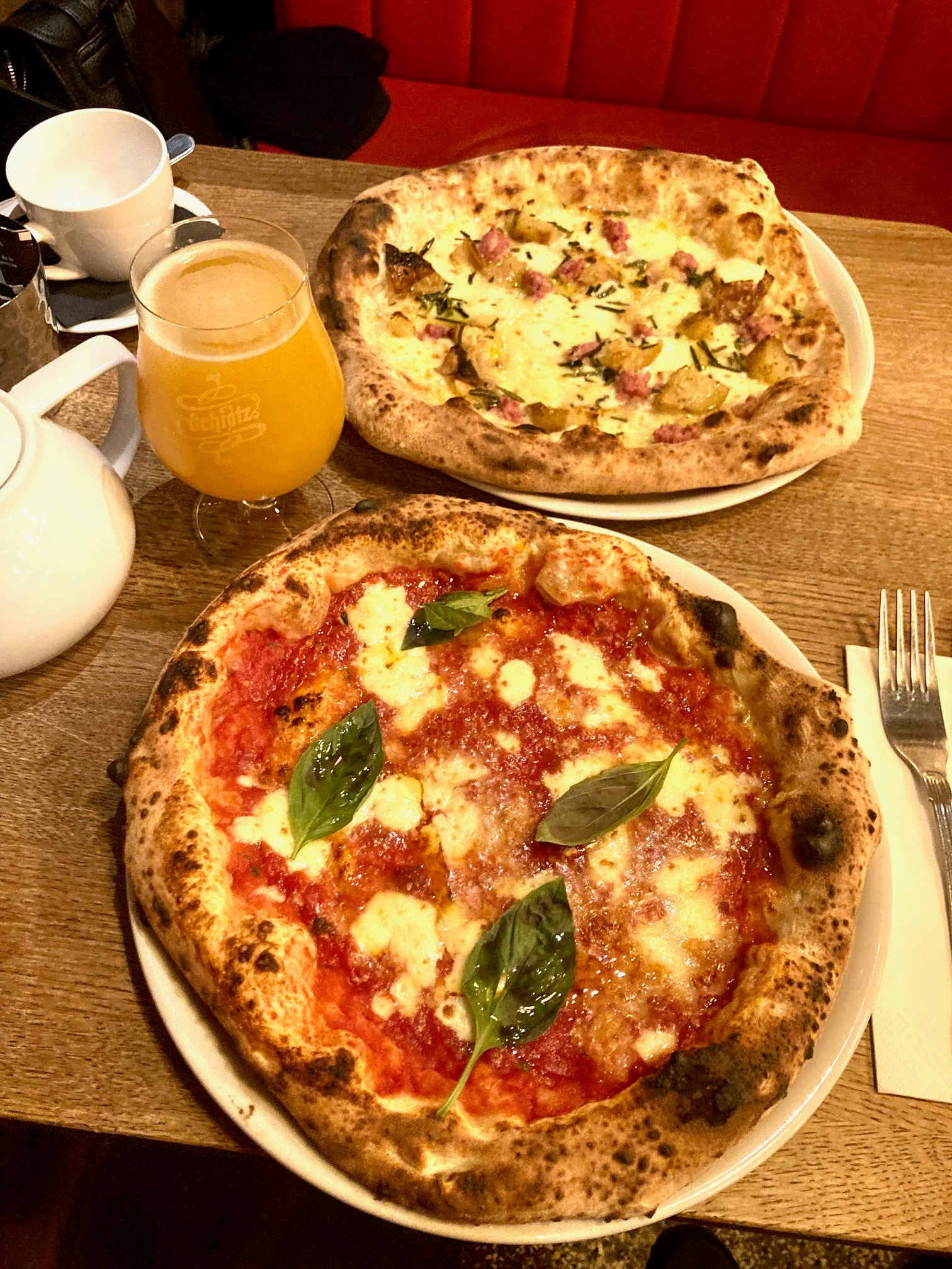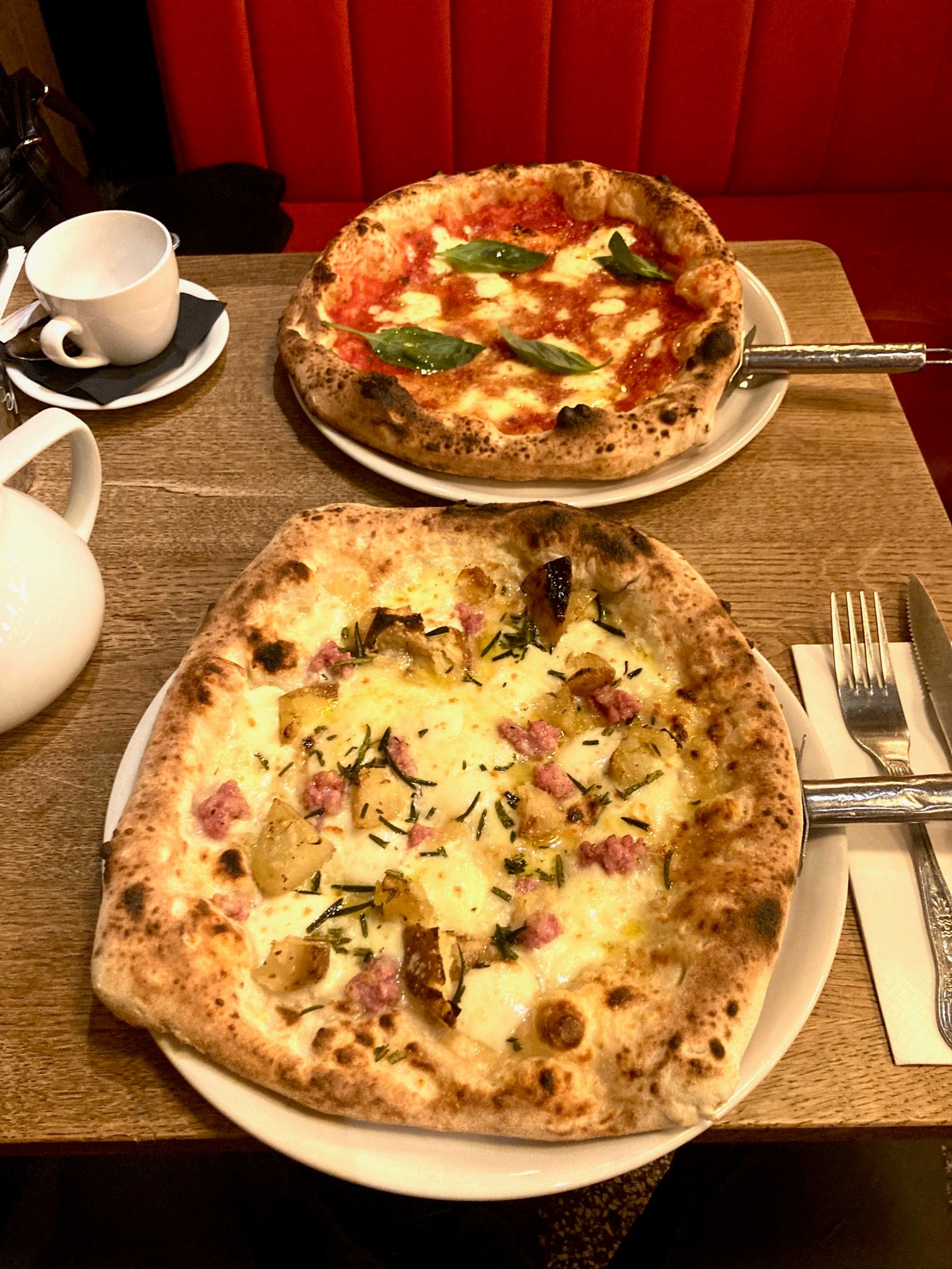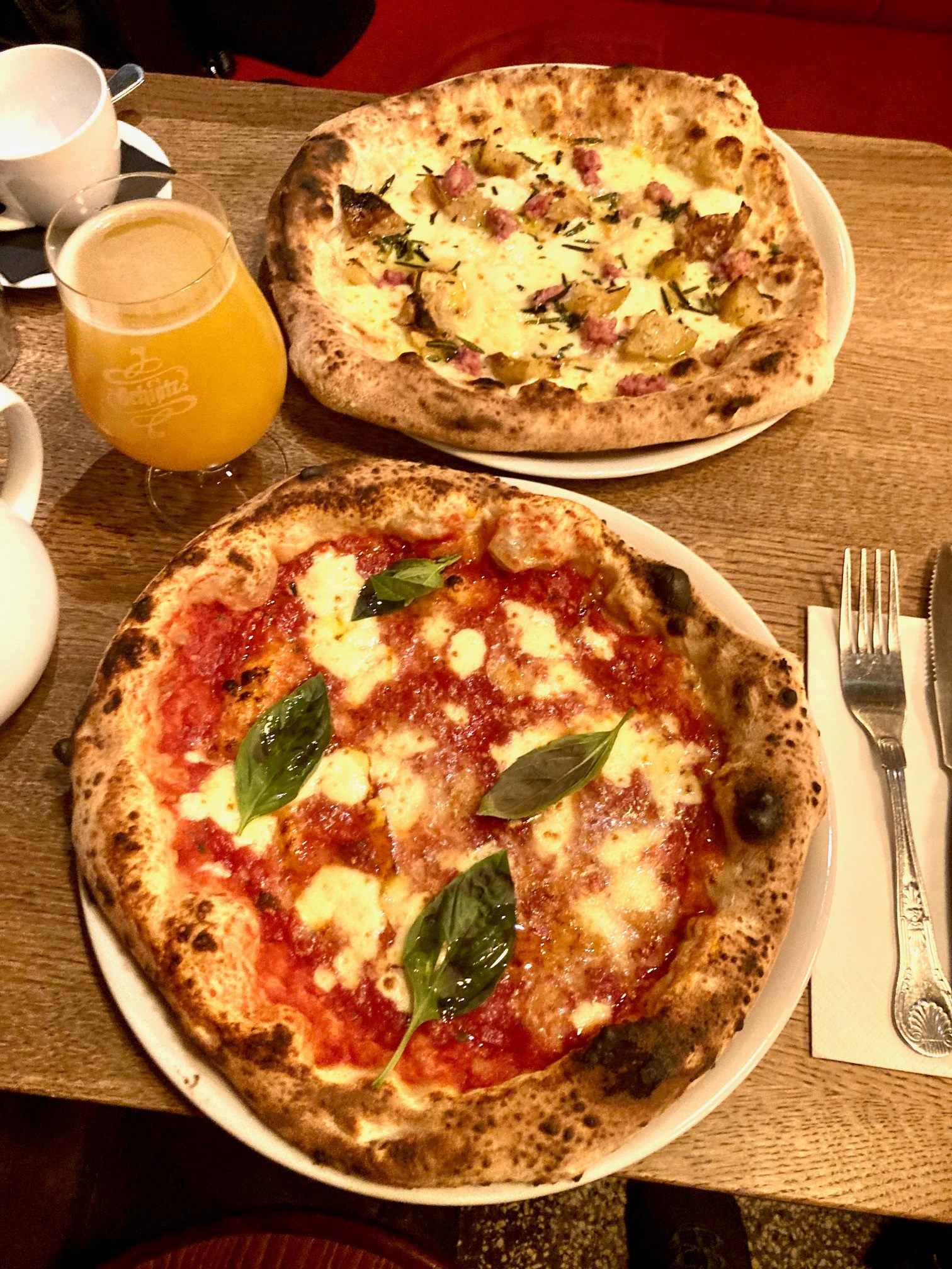 Krumpir je poprilično zastupljen i jedan je od glavnih sastojaka u danskoj prehrani pa se pizzerija Luca očito prilagodila danskoj tradiciji. Uz pizzu s krumpirom naručili smo i klasičnu Margheritu. Obje su pizze jako dobre moderne napoletane, kako izgledom tako i okusom. Tanka i mekana sredina s uzdignutim i prozračnim rubovima prekrivenim prepoznatljivim crnim flekama. Pizze su zasitne, ali lagane i bez naknadnog osjećaja težine u želucu.
