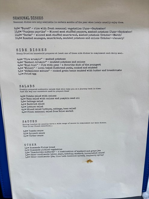 U ponudi su i glavna jela s prilogom poput purice s mlincima (15.90 eura) te junećih šnicli na lovački s roladom od kruha (22.20 eura). Sezonska jela uključuju đuveč (lipanj - rujan) za 9.80 eura, punjene paprike (lipanj - rujan) za 13.60 eura, sarmu s pireom (listopad - ožujak) za 13.60 eura te kobasice sa zeljem i restanim krumpirom za 15.60 eura.