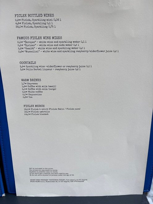 Na jelovniku su prvo istaknuti ficleki na daskicama, što je vidljivo i na zidu iza šanka. To su klasici poput masti, luka i paprike, sira i vrhnja s Dolca, čvaraka, špeka, kulenove seke, kuhane šunke, buđole i pečenice. Suho meso dekorativno visi i iza šanka, što je još jedan promišljen detalj koji zaokružuje Ficlekovu priču.