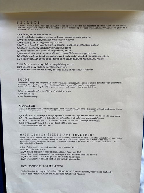 Od juha (4.80 do 5.60 eura) nude ajngemahtec, goveđu i paradajz juhu. Predjela uključuju štrukle, grenadirmarš, krpice sa zeljem, trgance s gljivama i salatu s kuhanom junetinom. Od glavnih jela bez priloga tu su faširanci (9.80 eura), teleća jetra (8.90 eura), pohani picek (10.90 eura), zagrebački odrezak (15.20 eura), naravni (18.60 eura) i tafelšpic (16.60 eura).