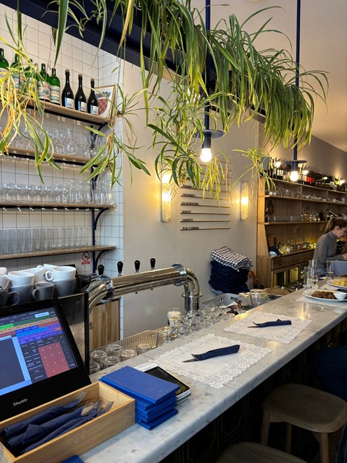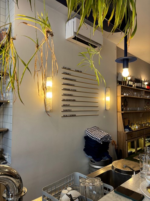 Otvorene police s čašama i retro bocama Jamničke Kiselice, viseće biljke i topla rasvjeta daju prostoru ležeran, gotovo mediteranski ugođaj, dok barski stolci i dugačak šank asociraju na europsku bistro atmosferu. Sve djeluje promišljeno, ali nenametljivo - elegantno i "namjerno", a opet opušteno i živahno.