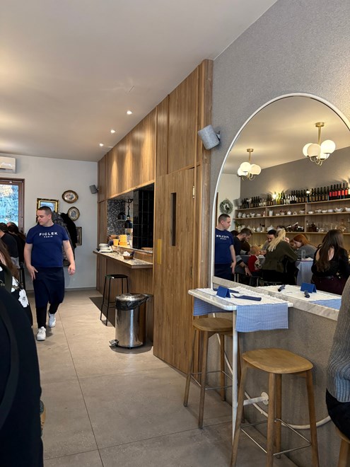 Interijer me se posebno dojmio jer nije ono što sam isprva očekivala. Lokali sa sličnim jelovnikom - ovdje je riječ o starozagrebačkim klasicima - često idu na onaj tipični “drvo i karirani stolnjaci” štih. Ficlek je drugačiji. Prostor spaja čistu, suvremenu estetiku s toplinom klasičnog bistroa. Dominiraju prirodni materijali - drvo, mramor i keramika - u kombinaciji s dubokim plavim i zelenim tonovima.