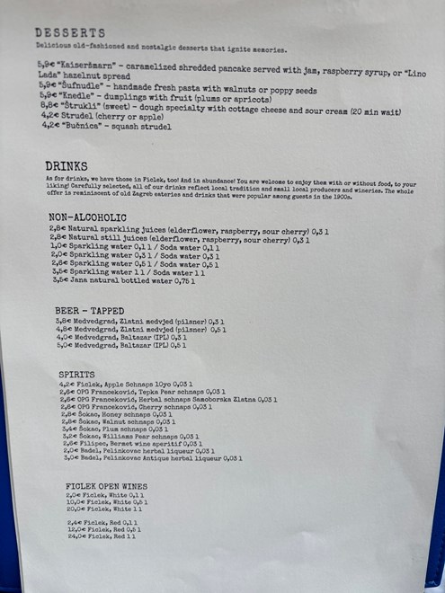 Deserti uključuju kaiseršmarn s Lino Ladom, džemom ili malinovcem, šufnudle s orasima ili makom, knedle sa šljivama ili marelicama, štrukle, štrudle i bučnicu, po cijenama od 4.20 do 5.90 eura. Od pića nude vlastite sokove, žestice s OPG-ova, piva te Ficlekova vina i pjenušce.