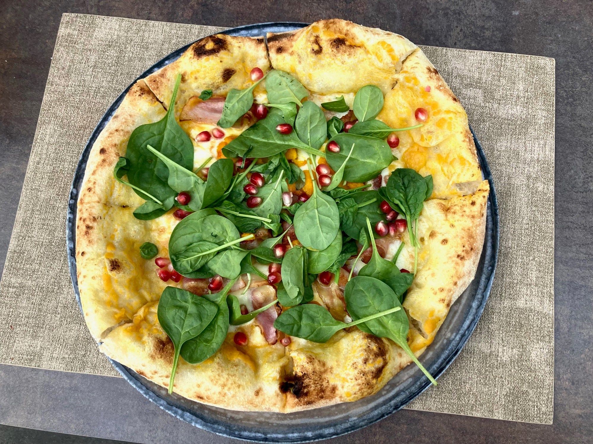 Naravno, osim izbjegavanja već pomalo dosadnih komentara, glavni mi je motiv kod prvog dolaska u neku pizzeriju isprobati nešto novo pa uvijek umjesto svoje omiljene pizze s mortadelom naručim gourmet pizzu koju nikada prije nisam probao. Ovo je prvi put da sam dobio pizzu koja uz umak od buče ima i komade pečene buče. Nadjev je neobičan: mozzarella, dimljena panceta, dimljeni sir i sjemenke nara. Sve skupa izbalansirano, sočno i vrlo ukusno.
