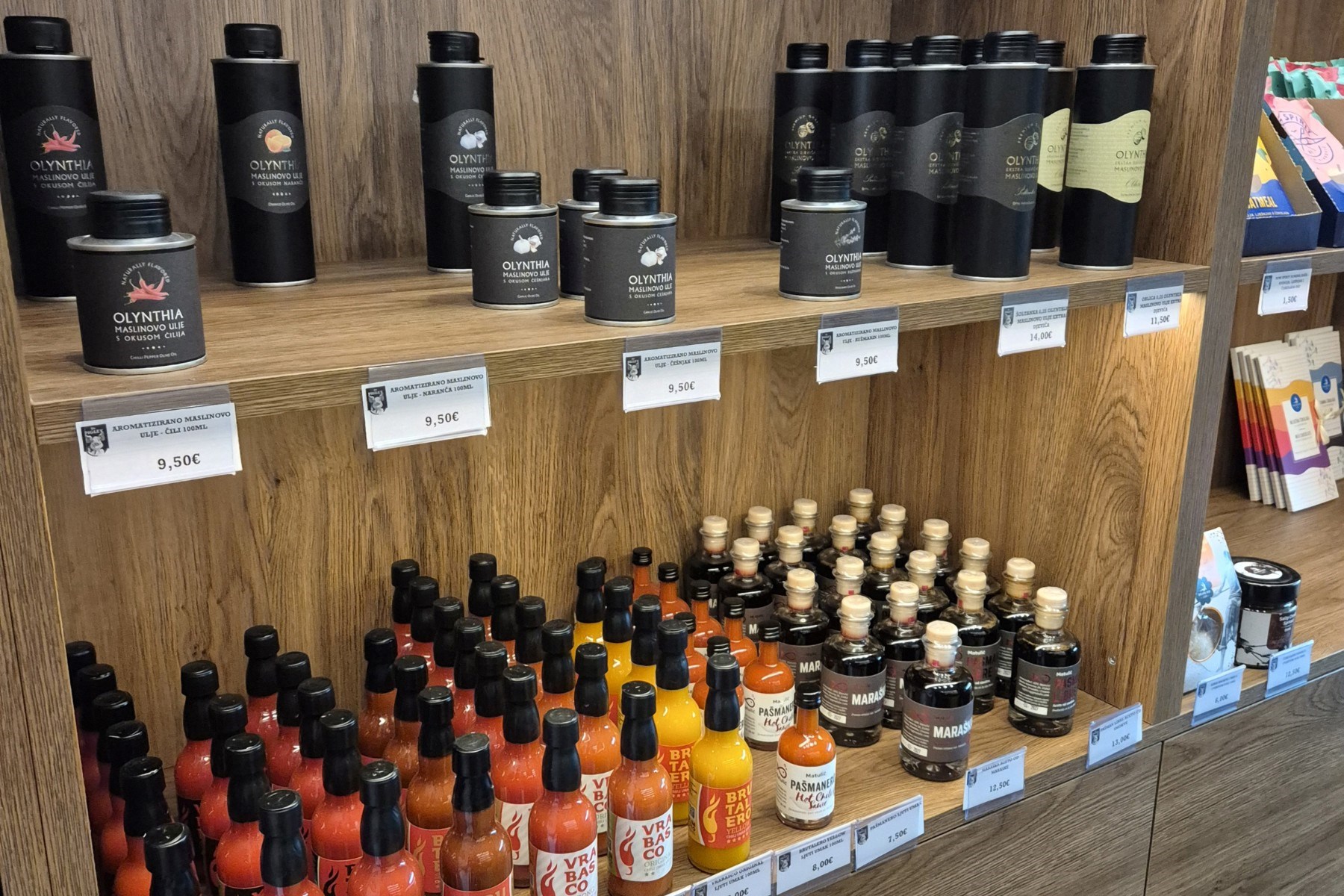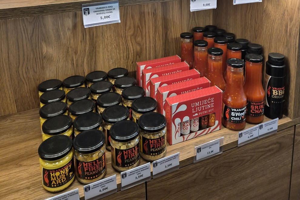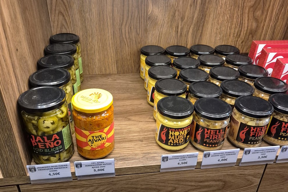 Ostatak polica također je zanimljiv: domaći autohtoni proizvodi iz Samobora poput bermeta i muštarde, Volim ljuto umaci, razna maslinova ulja (od 9.50 do 14 eura), Jalapeño ukiseljene papričice (370 ml za 4.50 eura), makedonski ajvar (290 g za 5 eura), BBQ umak za 5 eura, te nagrađivani aceto od maraske za 12.50 eura. Tu su i slatke sitnice poput zobenih kaša za 1.50 eura, keksa od smokve i meda za 6 eura, kao i čokoladnog namaza za 12.50 eura.