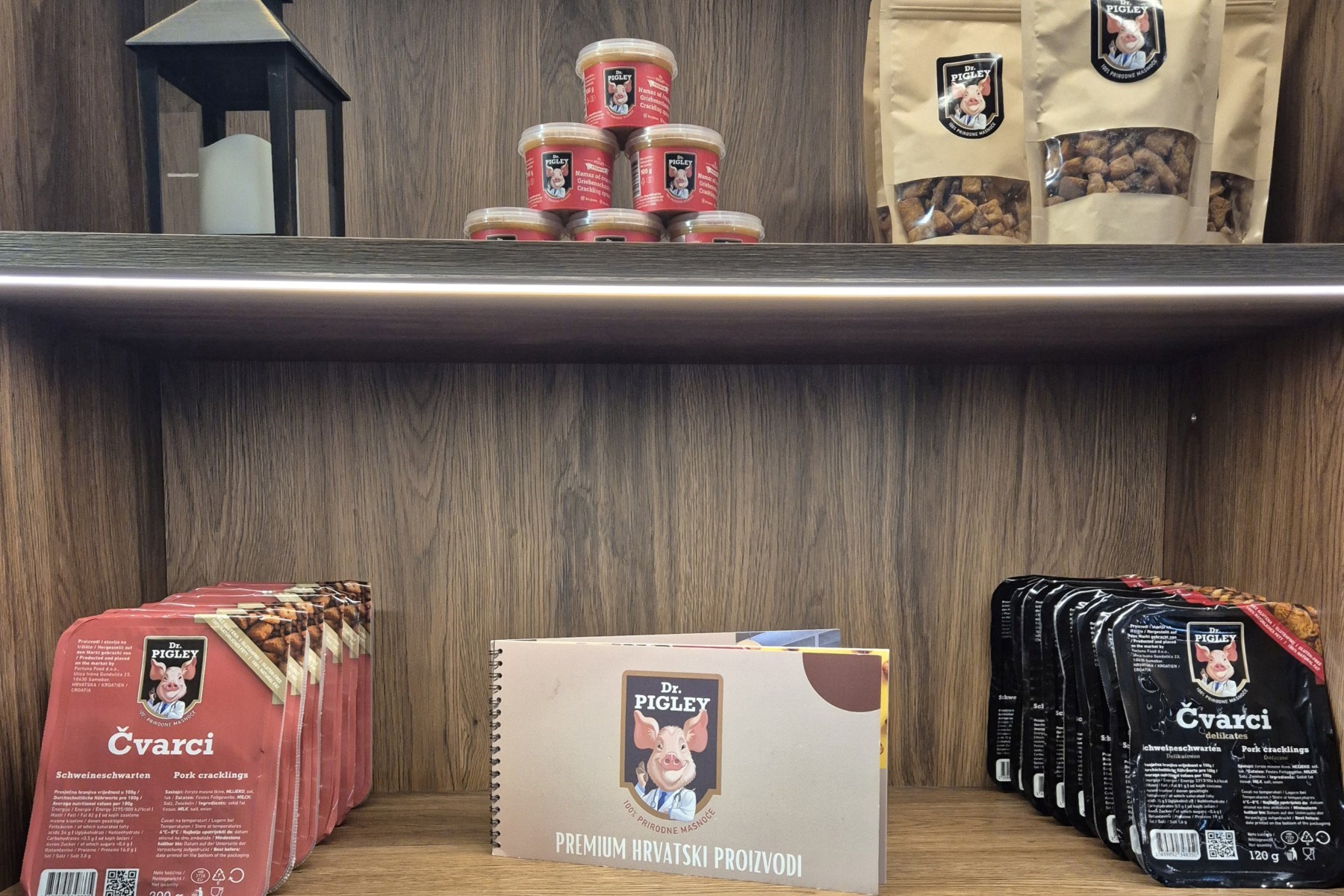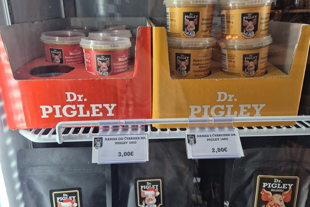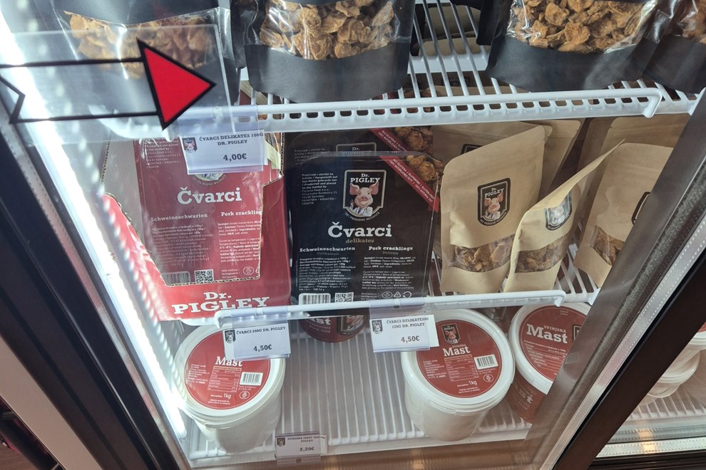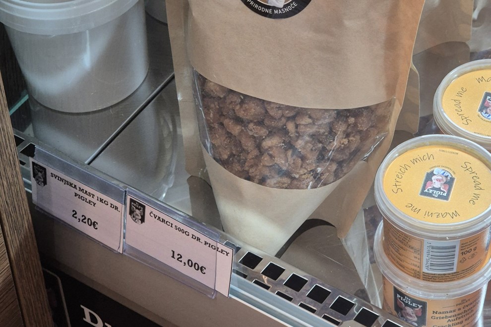 Naravno, zvijezda ponude ostaju čvarci, dostupni u raznim pakiranjima i oblicima - klasični čvarci prodaju se u pakiranju od 100 g za 2.50 eura, 200 g za 4.50 eura ili 500 g za 12 eura, a delikates stisnuti čvarci dolaze u pakiranjima od 20 g za 1.50 eura, 100 g za 4 eura i 120 g za 4.50 eura.