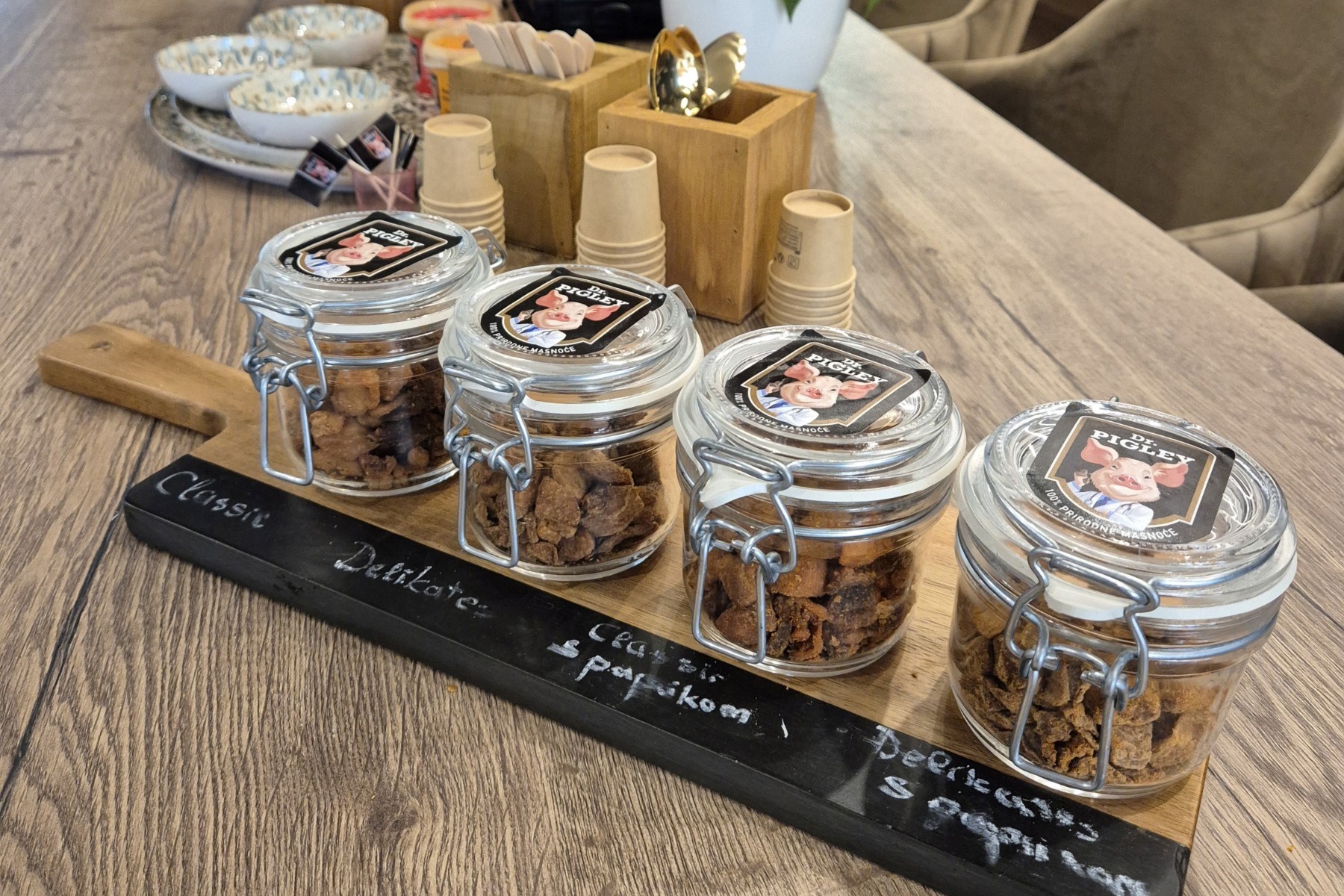 Naime, u sredini lokala nalazi se veliki stol s nekoliko stolaca, gdje svi kupci mogu sjesti i u miru kušati njihovu ponudu, a u ponudi su imali klasične i stisnute čvarke, kao i klasične i stisnute čvarke s dodatkom ljute paprike.