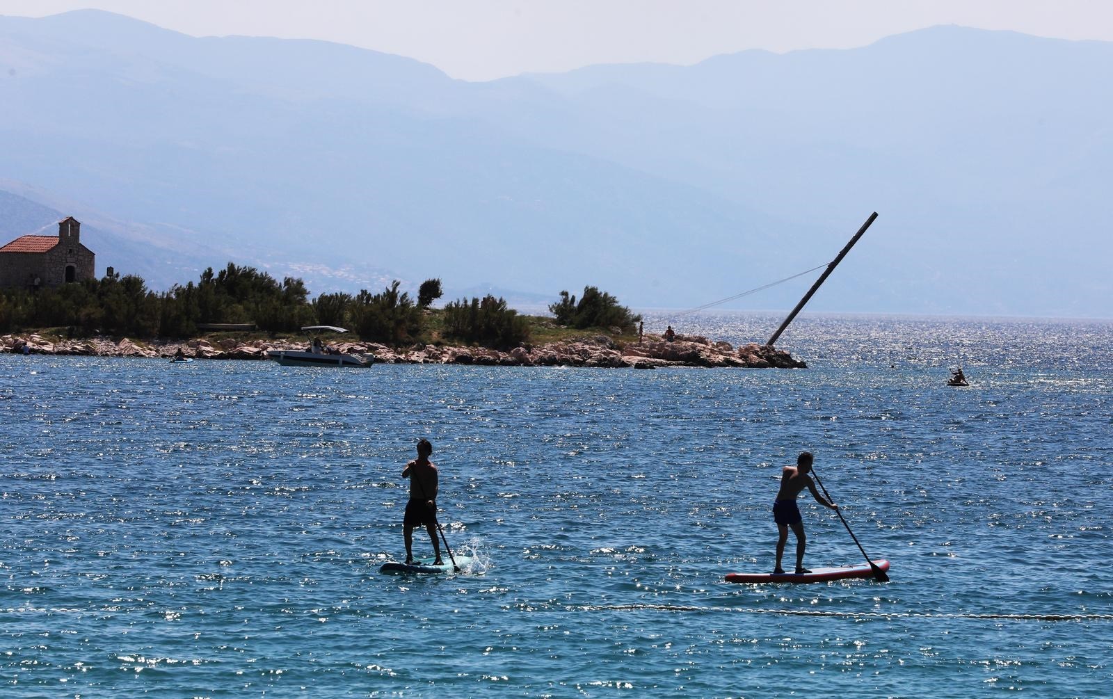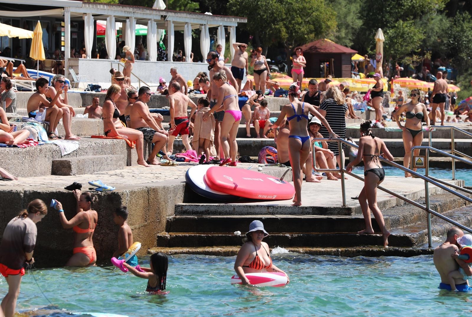 Na obali vlada gužva, kupači se rashlađuju u moru, skače se s mola, a mnogi uživaju na SUP daskama ili jednostavno traže hlad ispod suncobrana.