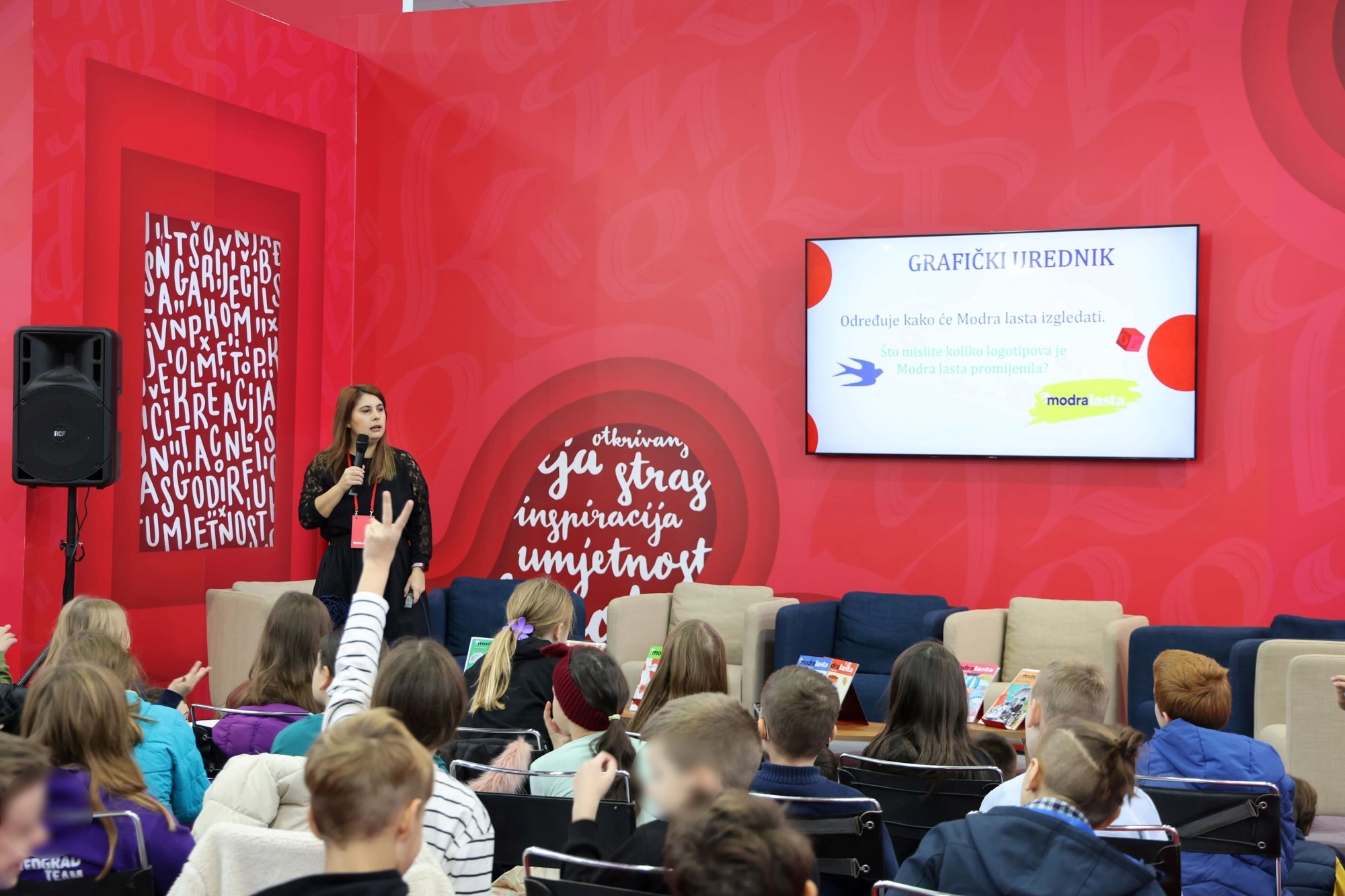 Prvog dana sajma održalo se predavanje za djecu o Modroj lasti. Predavači su učili djecu što je grafički tehničar, logotip, marketing i slično.