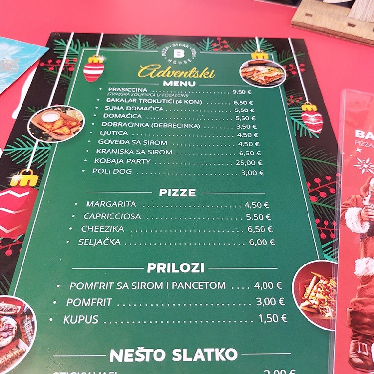 "Imamo pileće i goveđe burgere od 10 eura, a burger od jelena je 11.5 eura. Trenutačno imamo porcije gulaša od vepra za 11 eura, kranjske kobasice 5 eura i bit će za koji dan bakalara. Radit ćemo za koji dan specijalitete s vrganjima i divljači. Baziramo se na mesne proizvode koji nisu baš standardni."