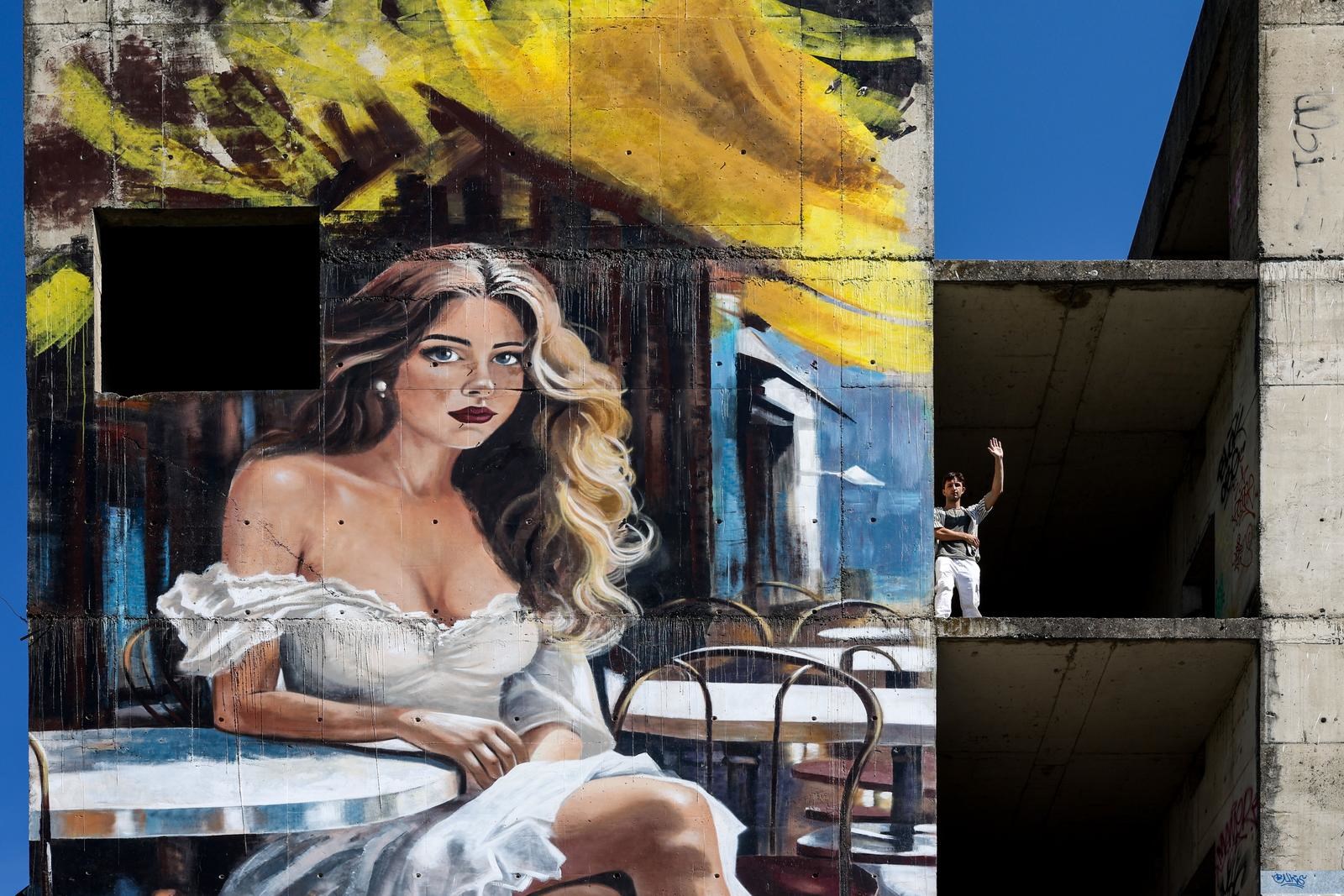DEJAN Šebestijan, mladi umjetnik iz Kotoribe koji već neko vrijeme živi u Zagrebu i bavi se tetoviranjem, predstavio je svoj novi rad - mural na zgradi nedovršene sveučilišne bolnice u Blatu, gdje je krajem svibnja izbio veliki požar.