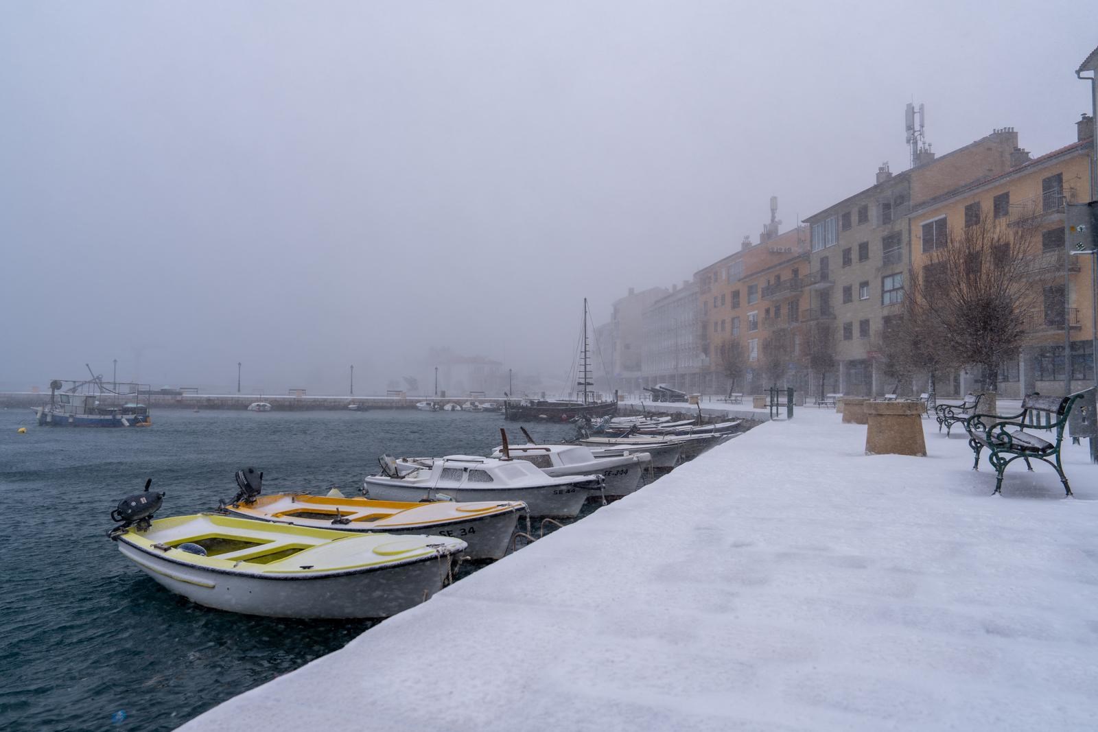 Na fotografijama snimljenima jučer u Senju vidi se kako je snijeg zabijelio ulice, nogostupe, zelene površine te barke u luci, dok je bura neumorno puhala cijeli dan.
