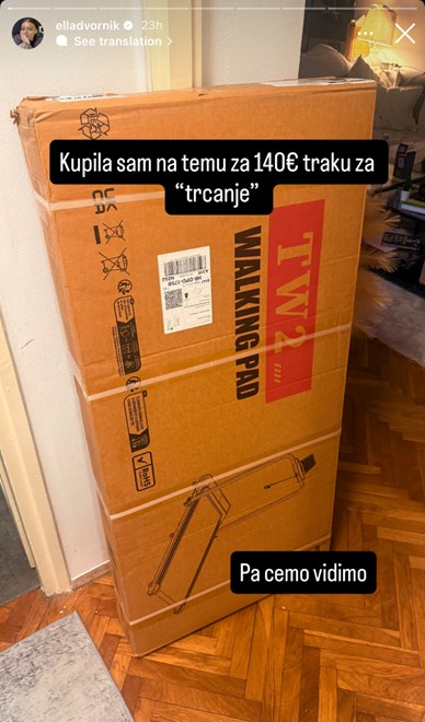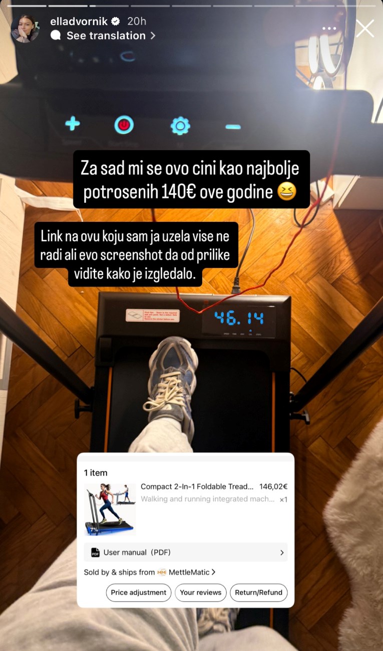 "Kupila sam na Temuu za 140 € traku za 'trčanje'", napisala je i dodala: "Pa ćemo da vidimo." U naknadnim Storyjima otkrila je da traka za sada radi, a u kasnijoj objavi ju je i pohvalila. "Za sada mi se ovo čini kao najbolje potrošenih 140 € ove godine 😆", napisala je.