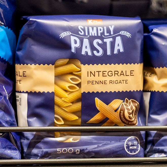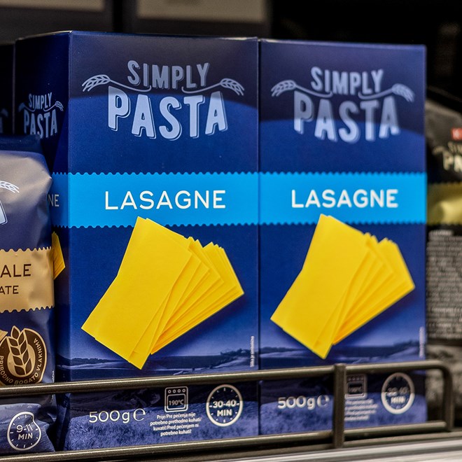 Iz Simply Pasta ponude ističu se rezanci s jajima, široki (400 g, akcijska cijena 0.89 €), lazanje (500 g, akcijska cijena 1.49 €), integralna penne rigate (500 g, akcijska cijena 0.99 €) te odabrane vrste tjestenine (400-500 g, akcijska cijena 1.29 €).