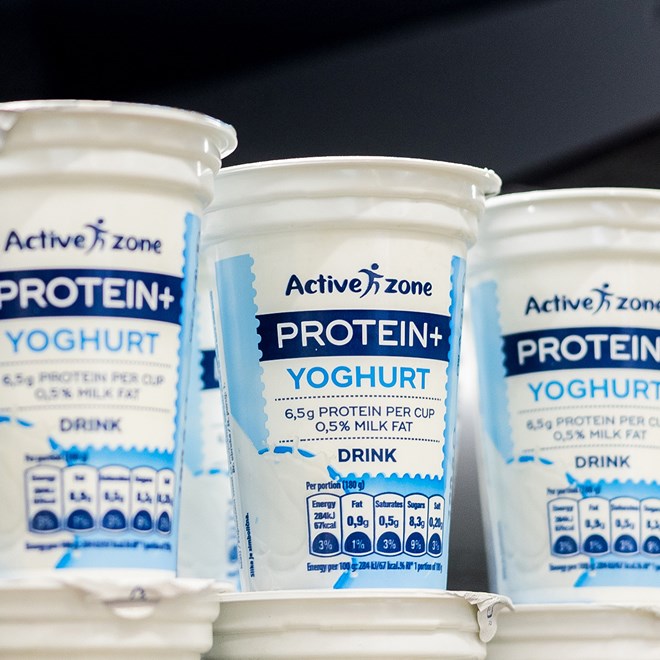 Active Zone linija nudi širok asortiman, a izdvajaju se Protein+ posni sir (500 g, 1.39 €), Protein+ skyr (500 g, 1.39 €), Protein+ tekući jogurt s 0.5% m.m. (180 g, akcijska cijena 0.25 €) te Protein+ tekući jogurt s 0.5% m.m. (1 kg, akcijska cijena 0.99 €).