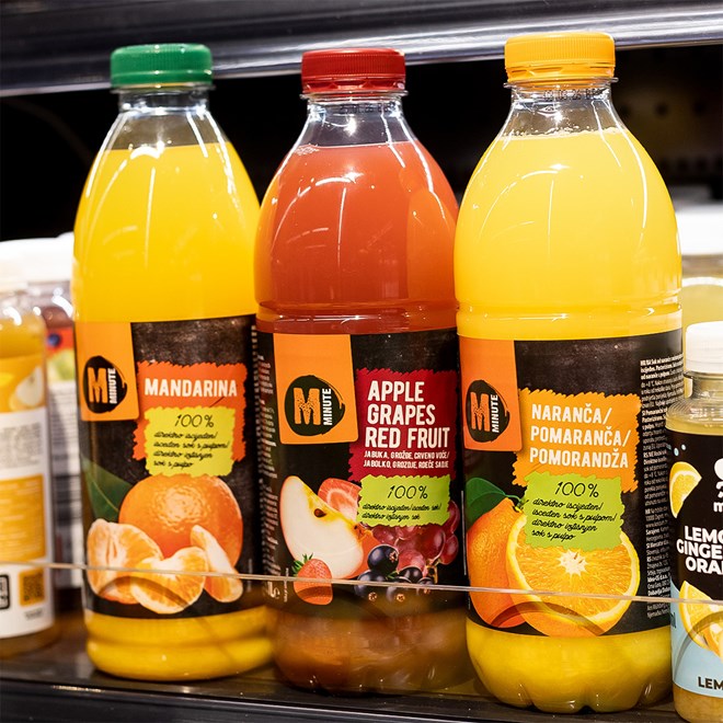 U obilasku Konzumove trgovine posebno su nam za oko zapeli Minute 100% sokovi - naranča (1 l, akcijska cijena 2.79 €), mandarina (1 l, 2.49 €), jabuka-crveno voće (1 l, akcijska cijena 2.49 €) te jabuka (1 l, akcijska cijena 2.19 €).