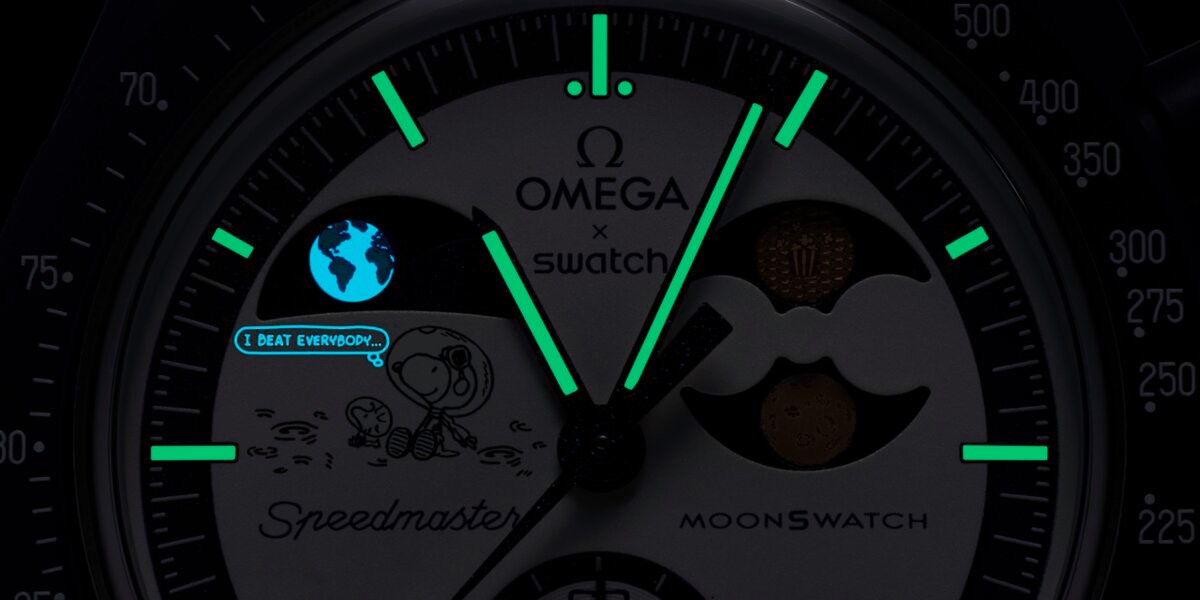 Nasuprot tome, na poziciji 10 sati, indikator Zemljinih mijena prikazuje naš planet viđen s Mjeseca, pri čemu oceani svijetle električno plavom bojom pod UV svjetlom. Ispod ovog prikaza, popularni likovi Snoopy i Woodstock promatraju nebo s minijaturnog Mjesečevog krajolika koji skriva tajnu frazu, vidljivu samo pod ultraljubičastim osvjetljenjem.