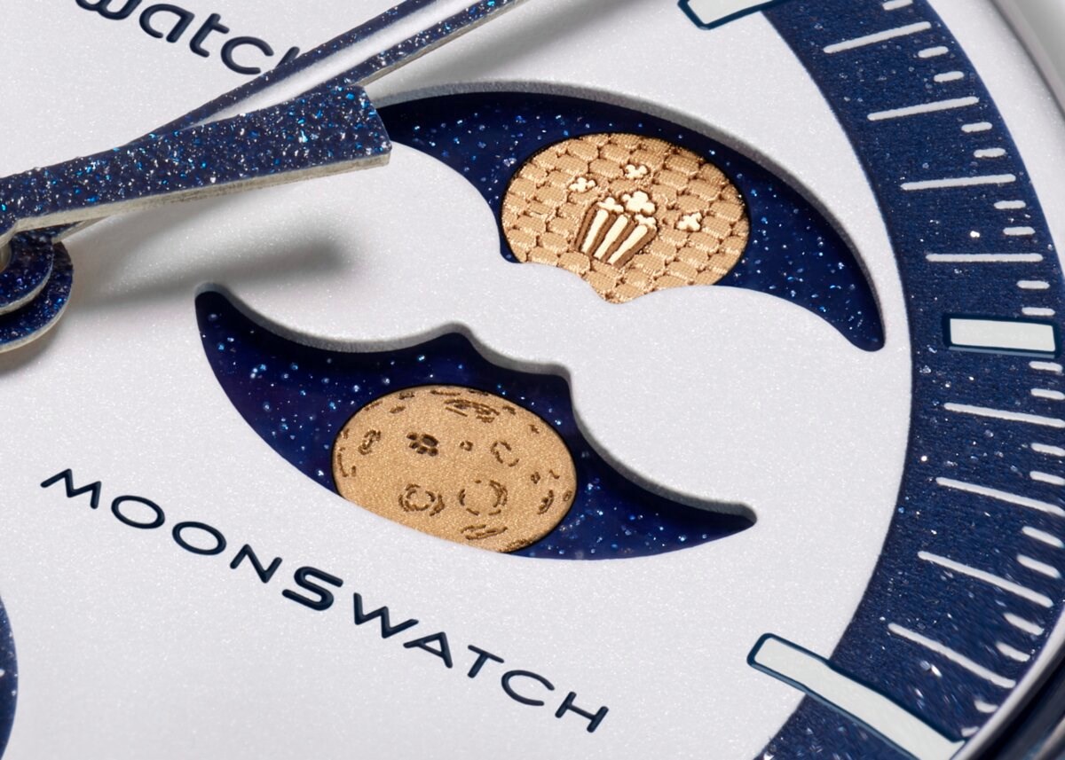 Tema mjeseca suptilno je ugrađena u jednu od najistaknutijih funkcija sata. Na poziciji 2 sata, dvostruki prikaz Mjesečevih mijena, izrađen od OMEGA-inog patentiranog Moonshine zlata, donosi jedinstven detalj - Mjesečeva površina preoblikovana je u redove zlatnih zrna kukuruza, sa ilustriranom kutijom za kokice u središtu.