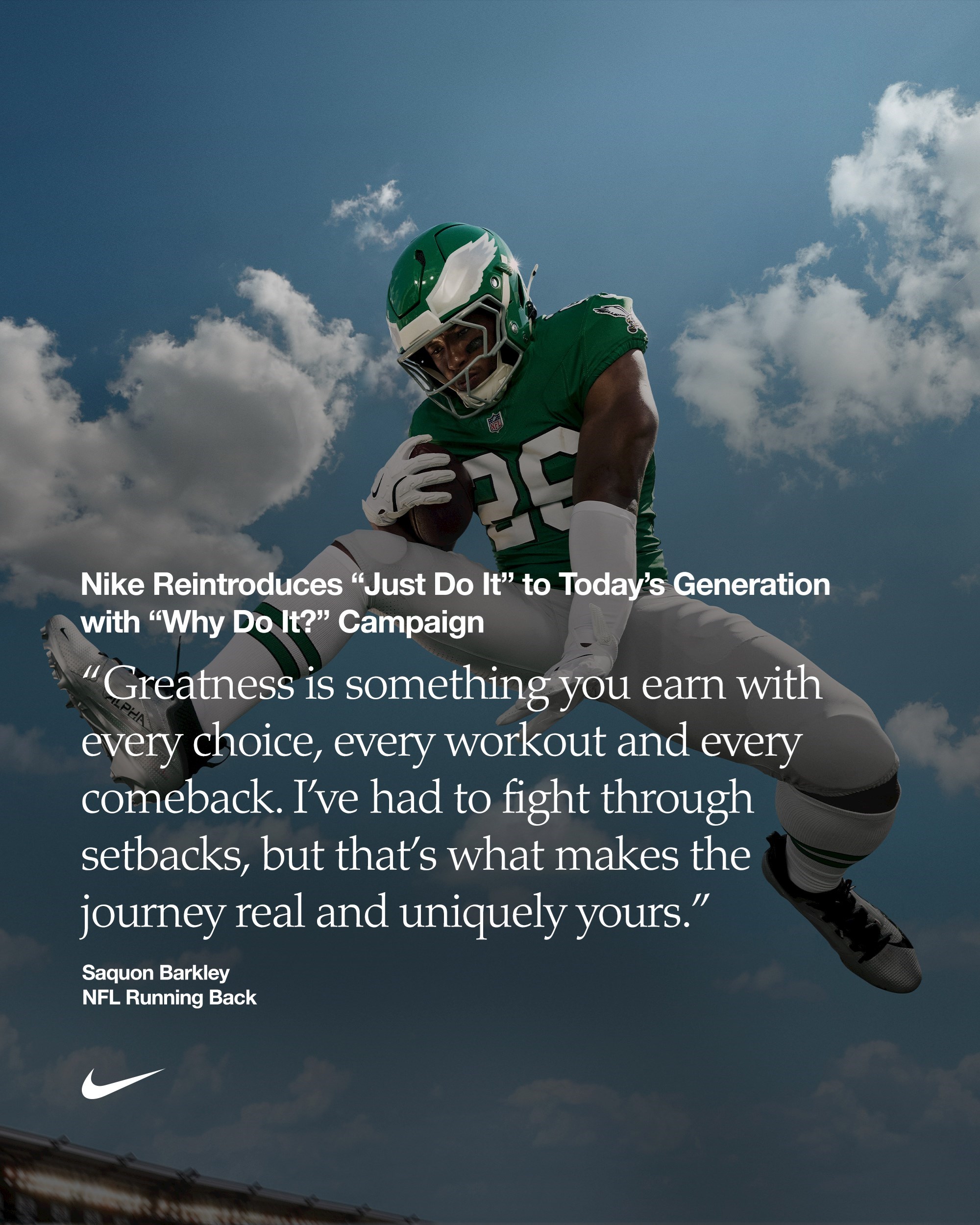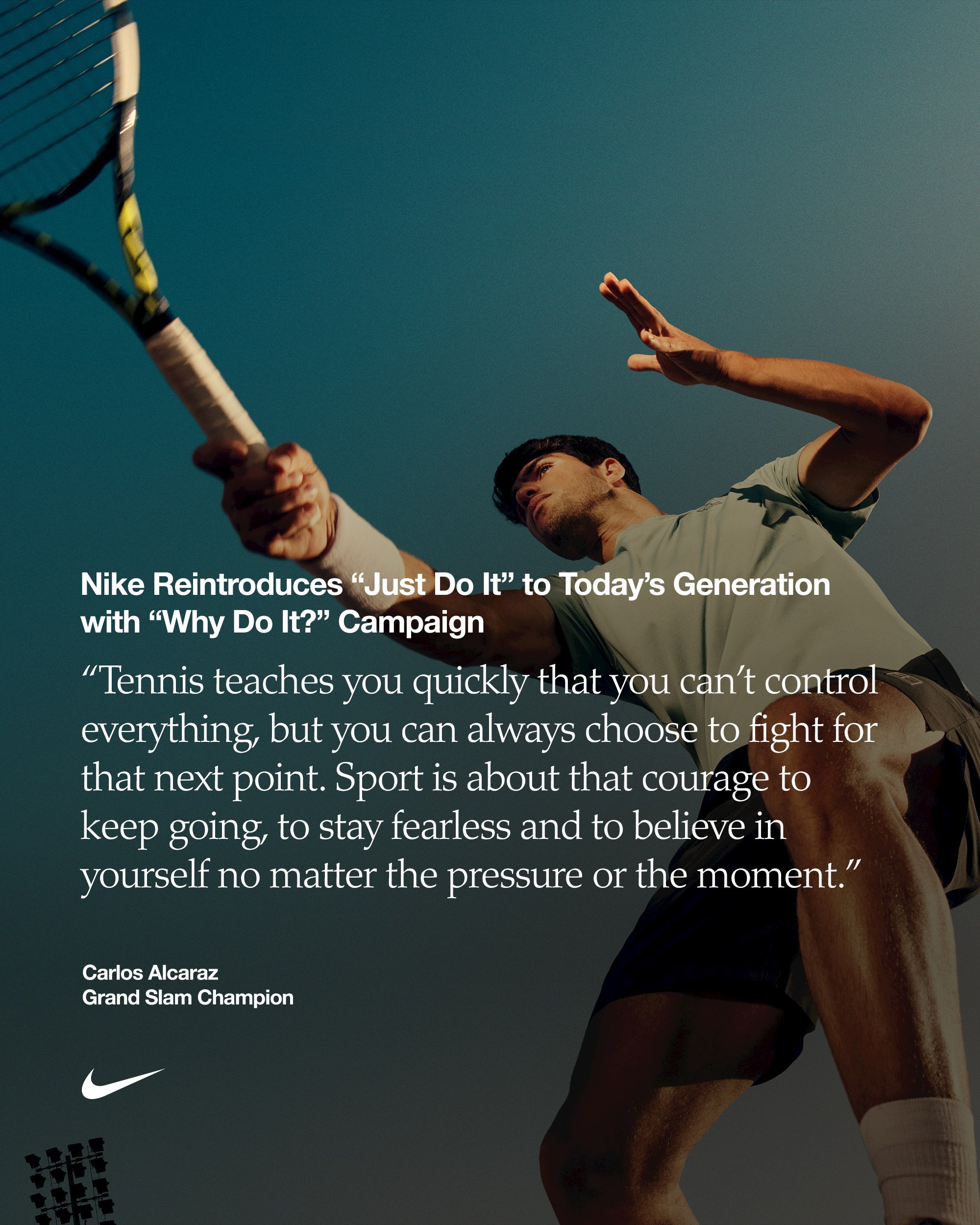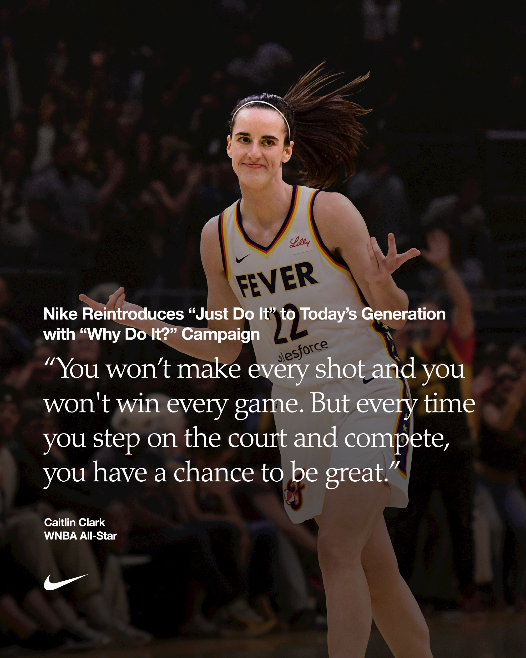 Prošlog četvrtka, Nike je "ponovno predstavio" kampanju "današnjoj generaciji". Cilj kampanje "Why do it?" je "povezati se s mladim sportašima tamo gdje jesu" i da "veličinu prikaže kao izbor, a ne kao ishod.".