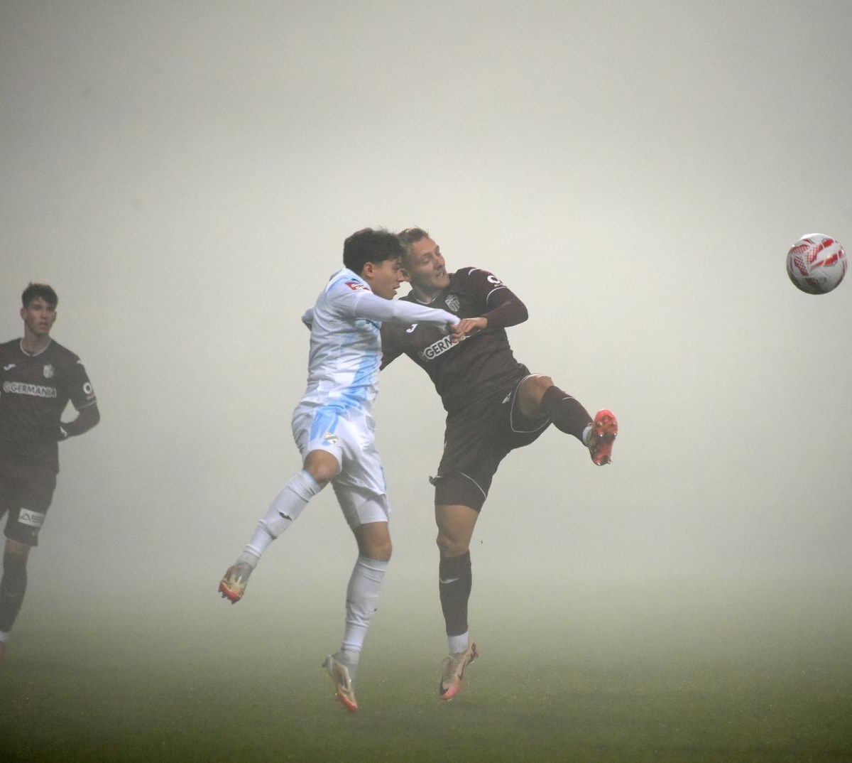 Utakmica je prekinuta već tri minute. Sudac u razgovoru s igračima vijeća o nastavku, vidljivost je užasna.