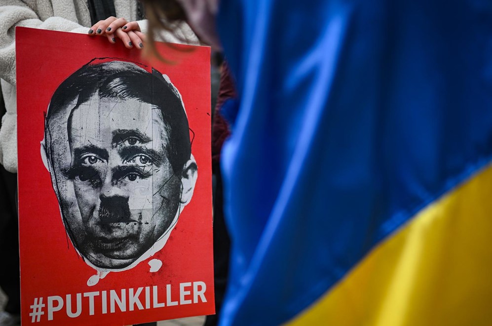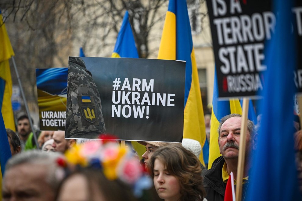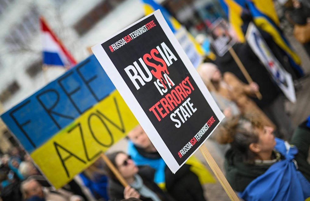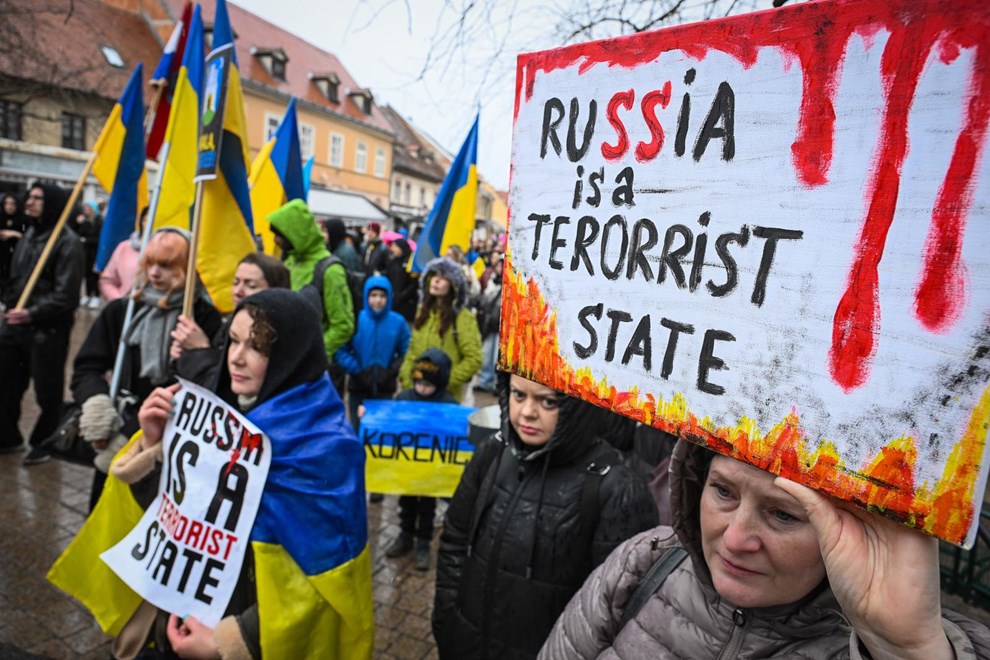Na Europskom trgu se okupilo 100-tinjak osoba s ukrajinskim zastavama i transparentima poput "Danas Ukrajina, sutra Europa" ili "Rusija je teroristička država".