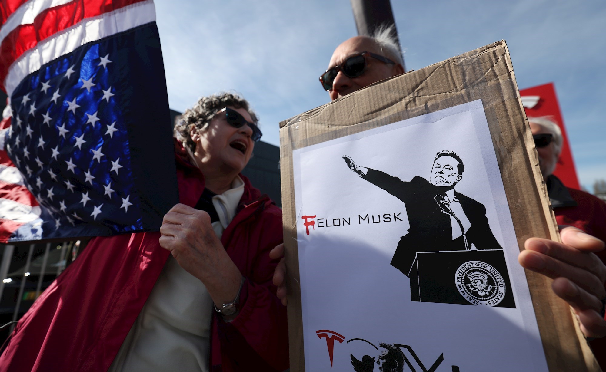 U San Franciscu se ispred Teslinog salona okupilo oko 200 ljudi, a prosvjednici su blokirali promet, zbunjujući autonomna vozila koja su pokušavala zaobići masu. Prolaznici su trubili u znak podrške, a neki su podizali transparente s natpisima poput "Spali svoju svastiku prije nego ona spali tebe." Američke zastave vijorile su se okrenute naopako.