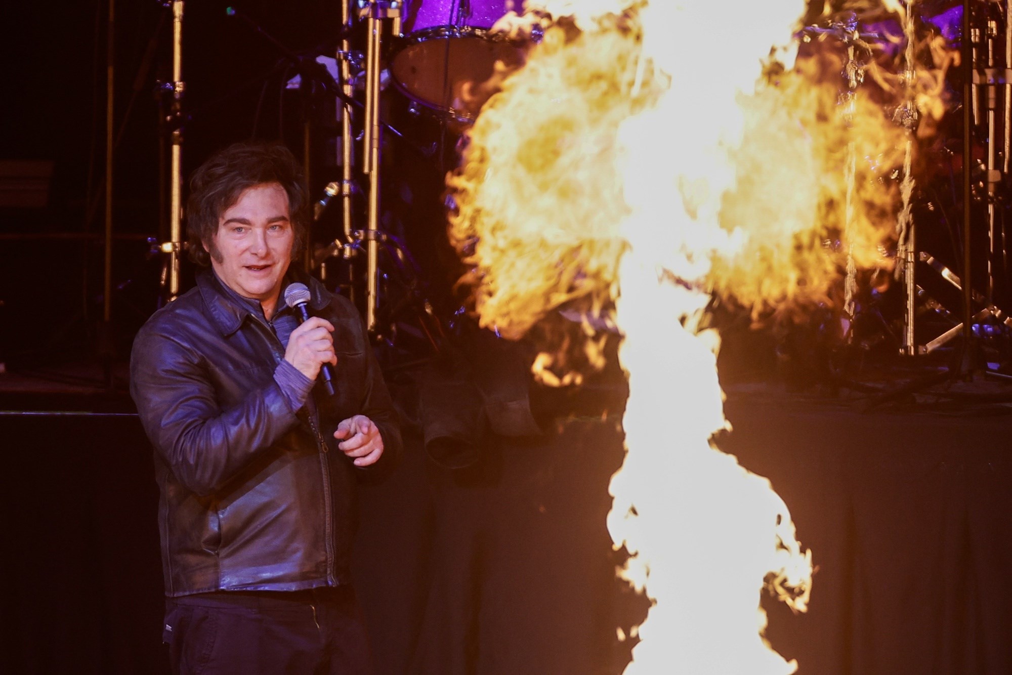Na divovskom ekranu, eksplozije atomskih bombi i rušenje zgrada najavljivale su uskrsnuće. Milei je zgrabio mikrofon i zapjevao "Demoliendo hoteles" (Rušenje hotela), himnu Charlyja Garcíje.