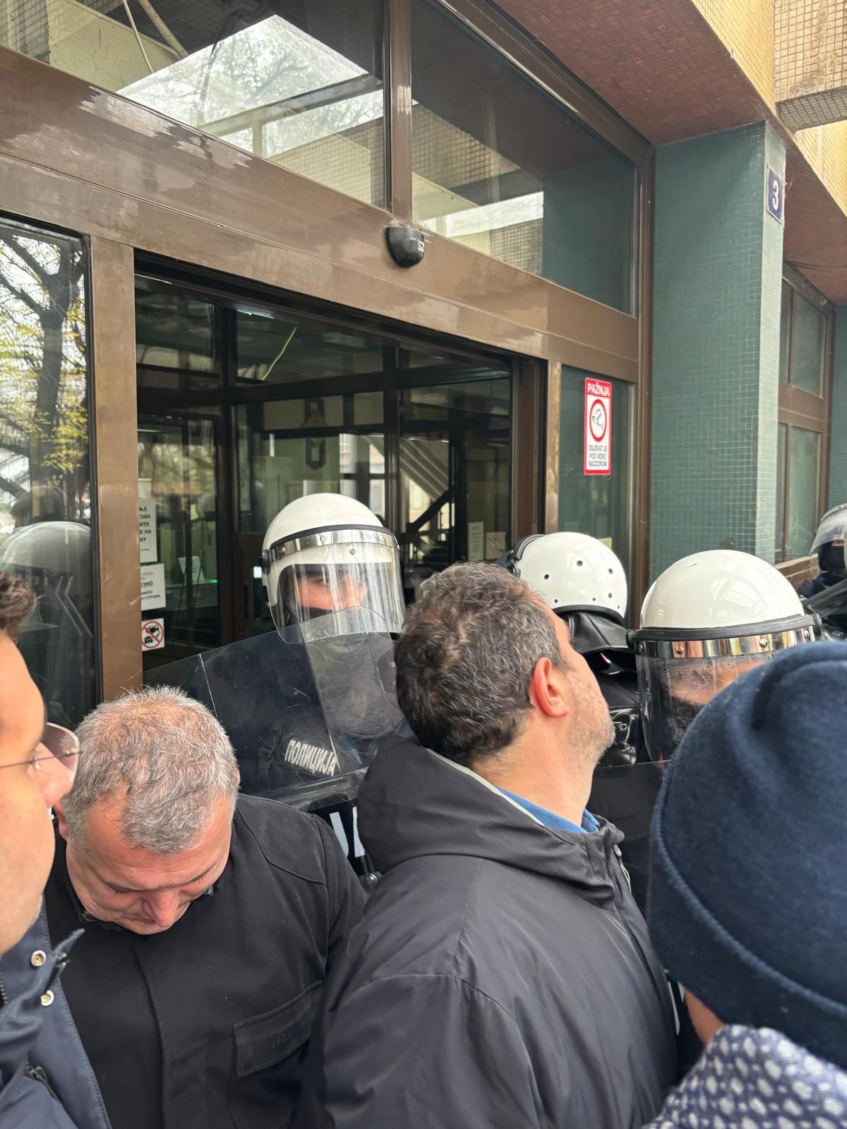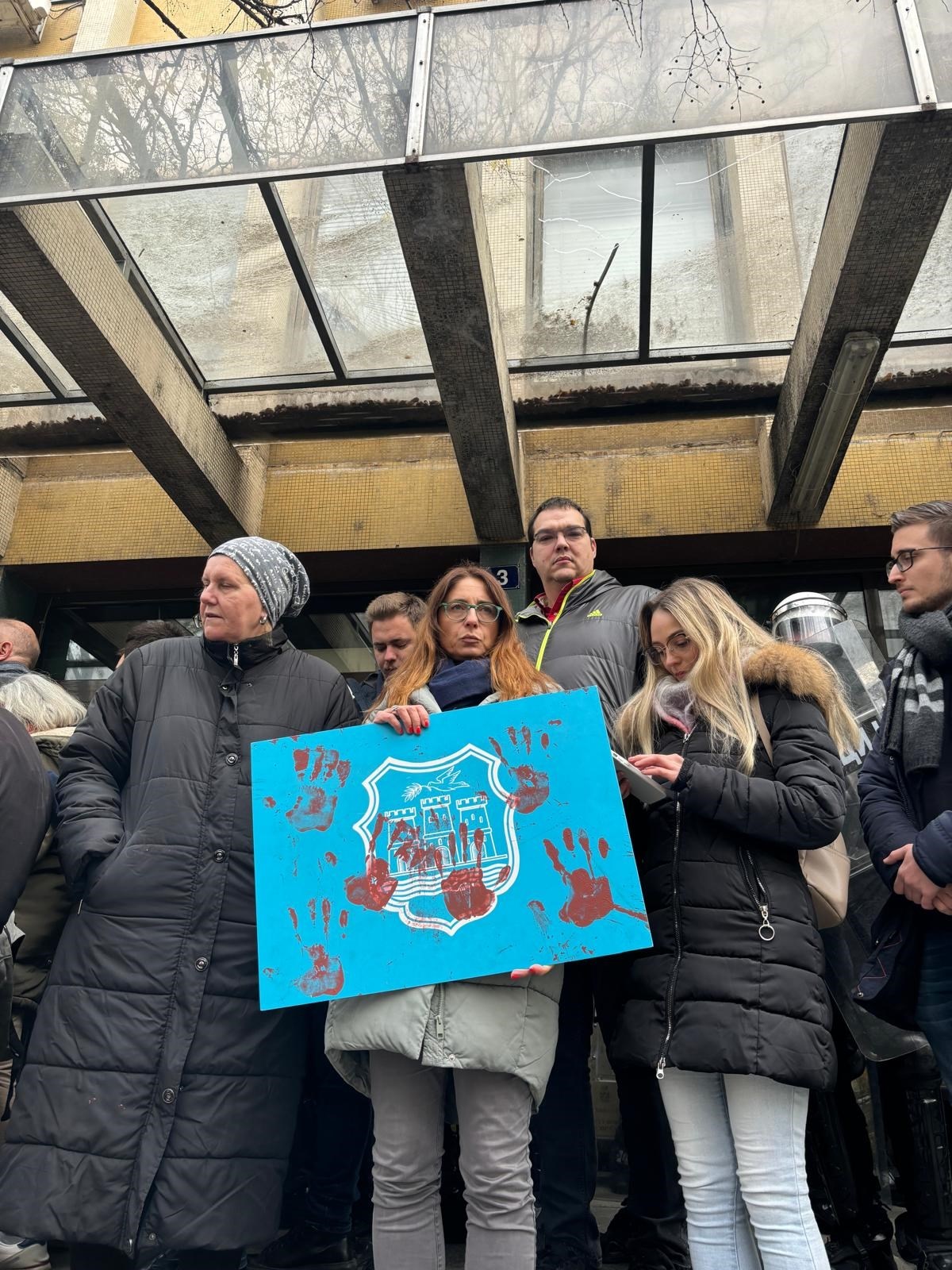 Policajci su ga više puta opomenuli da se okupljeni sklone i maknu na drugu stranu stepenica ako žele nastaviti prosvjed.