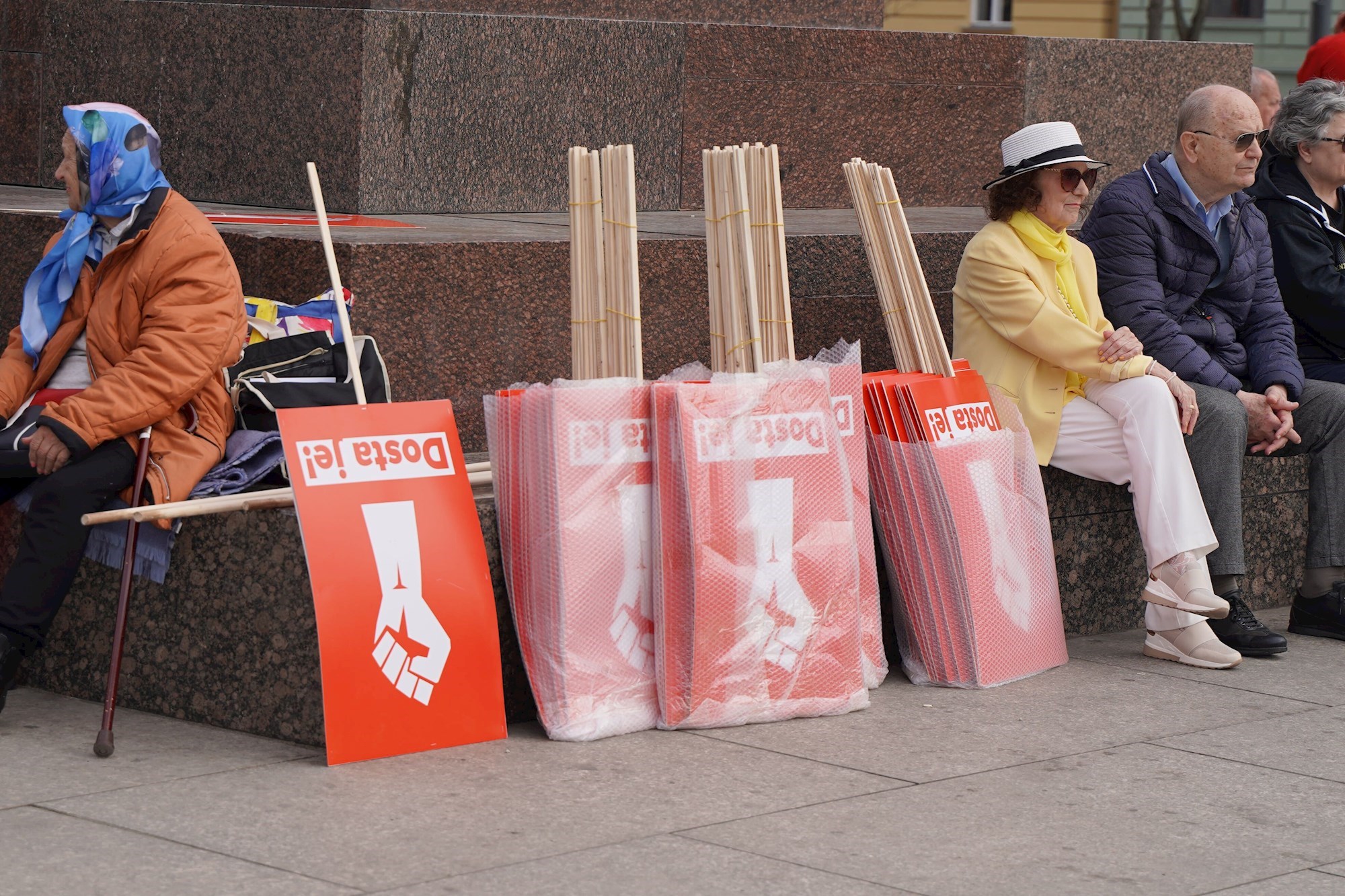 Okupljeni prosvjednici nosili su transparente sa slikom stisnute šake i porukom "Dosta je!”, hrvatske i stranačke zastave kao i transparente s natpisima "HDZ zločinačka organizacija", "Vadite šatore", "Go Laura Go", "Rijeke pravde dolaze".